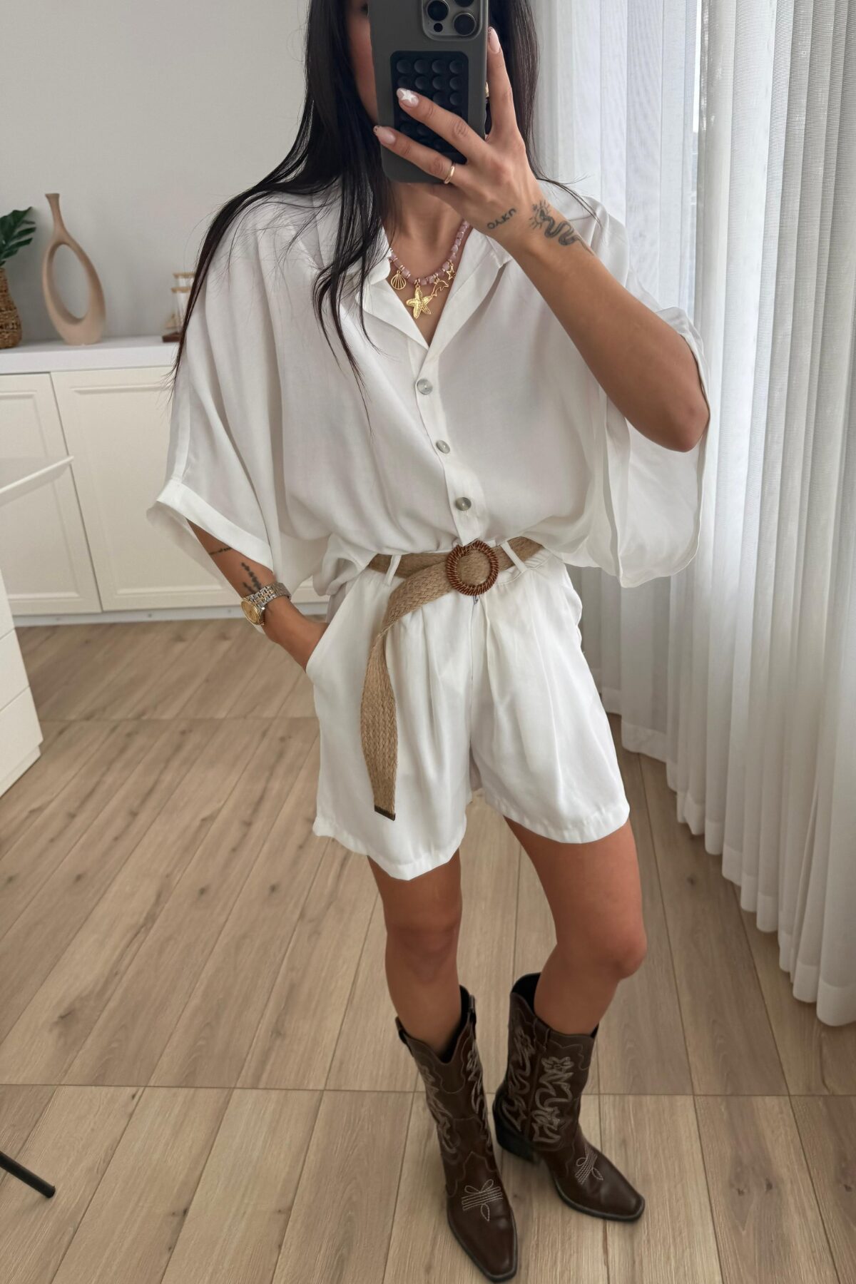 Hasır Kemerli Şort Gömlek Takım Beyaz