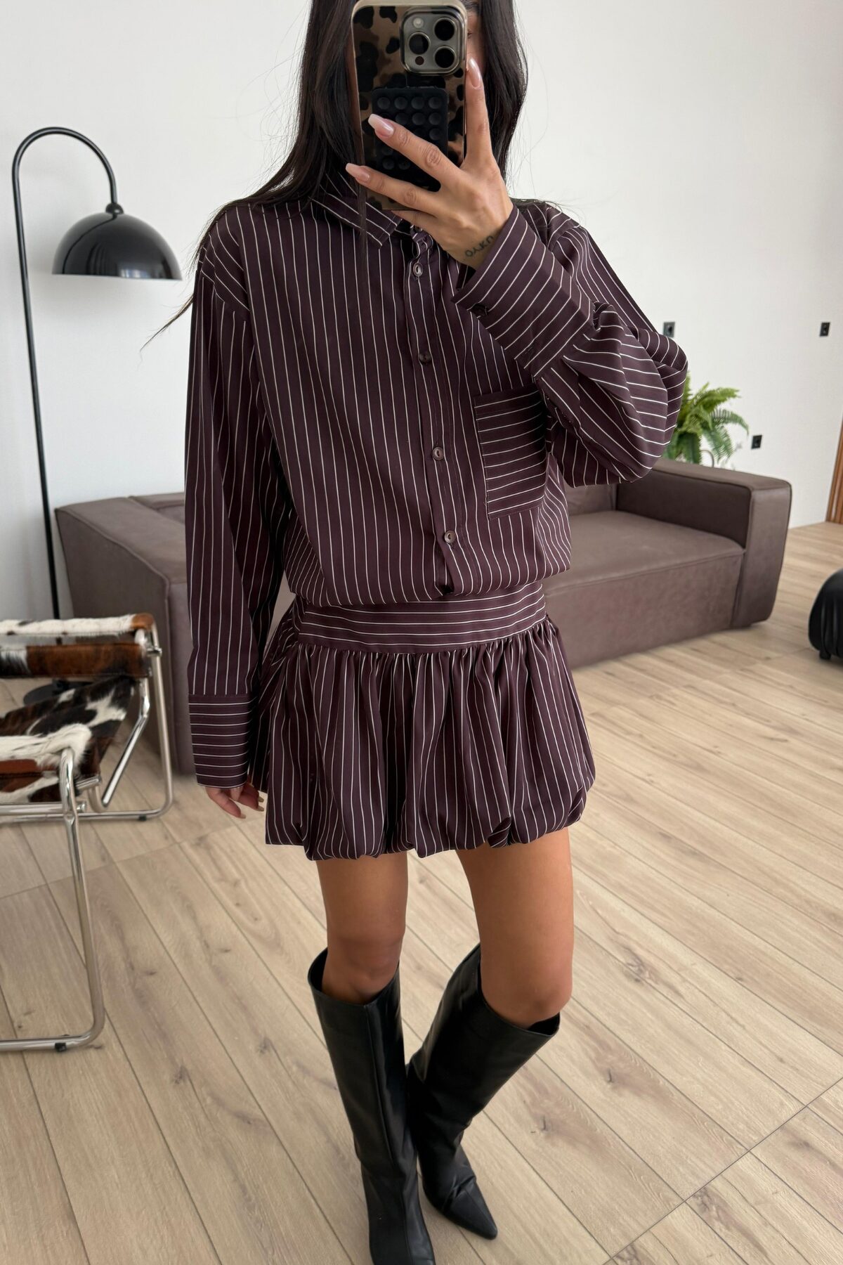 İçi Şortlu Çizgili Balon Etek Takım Kahverengi