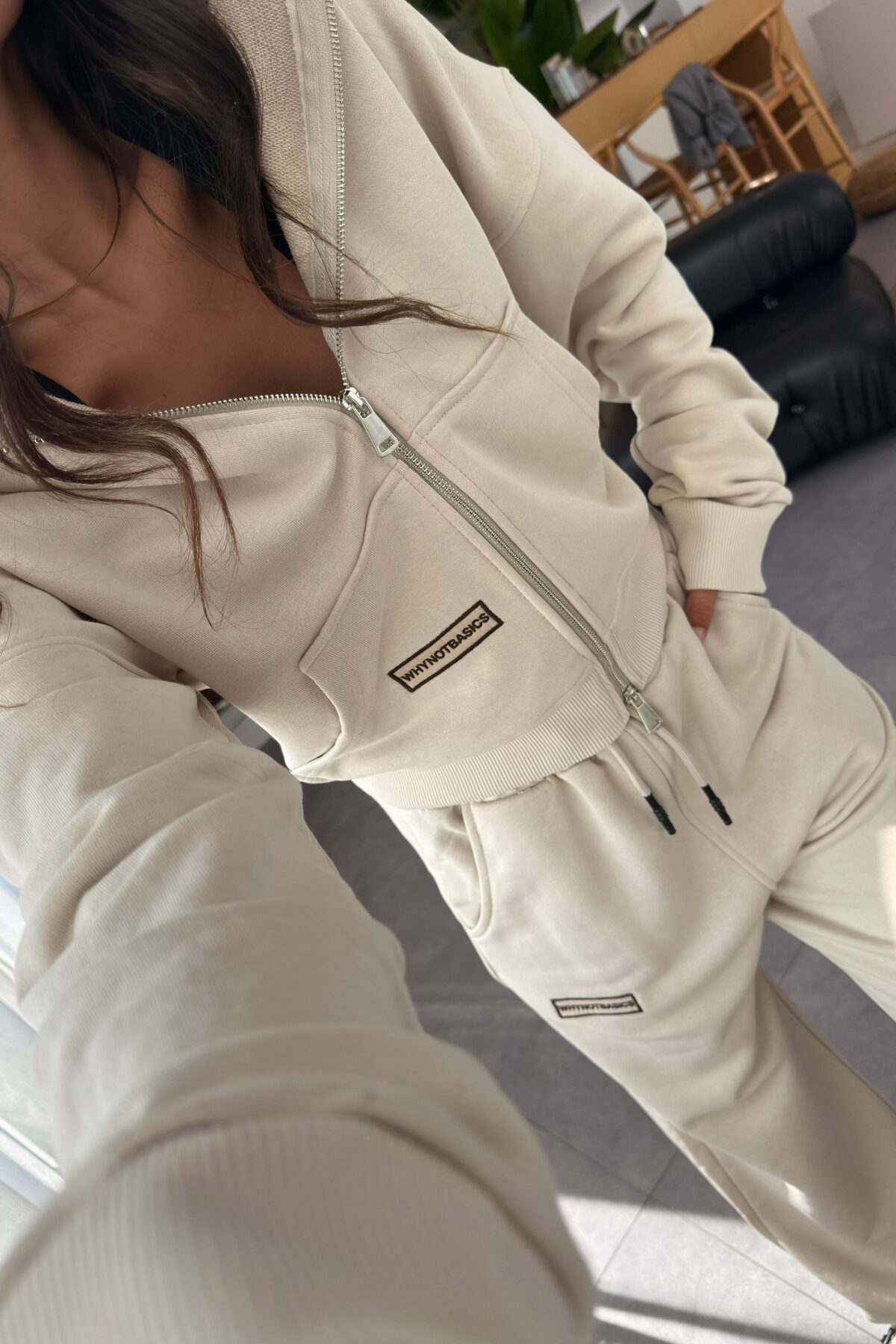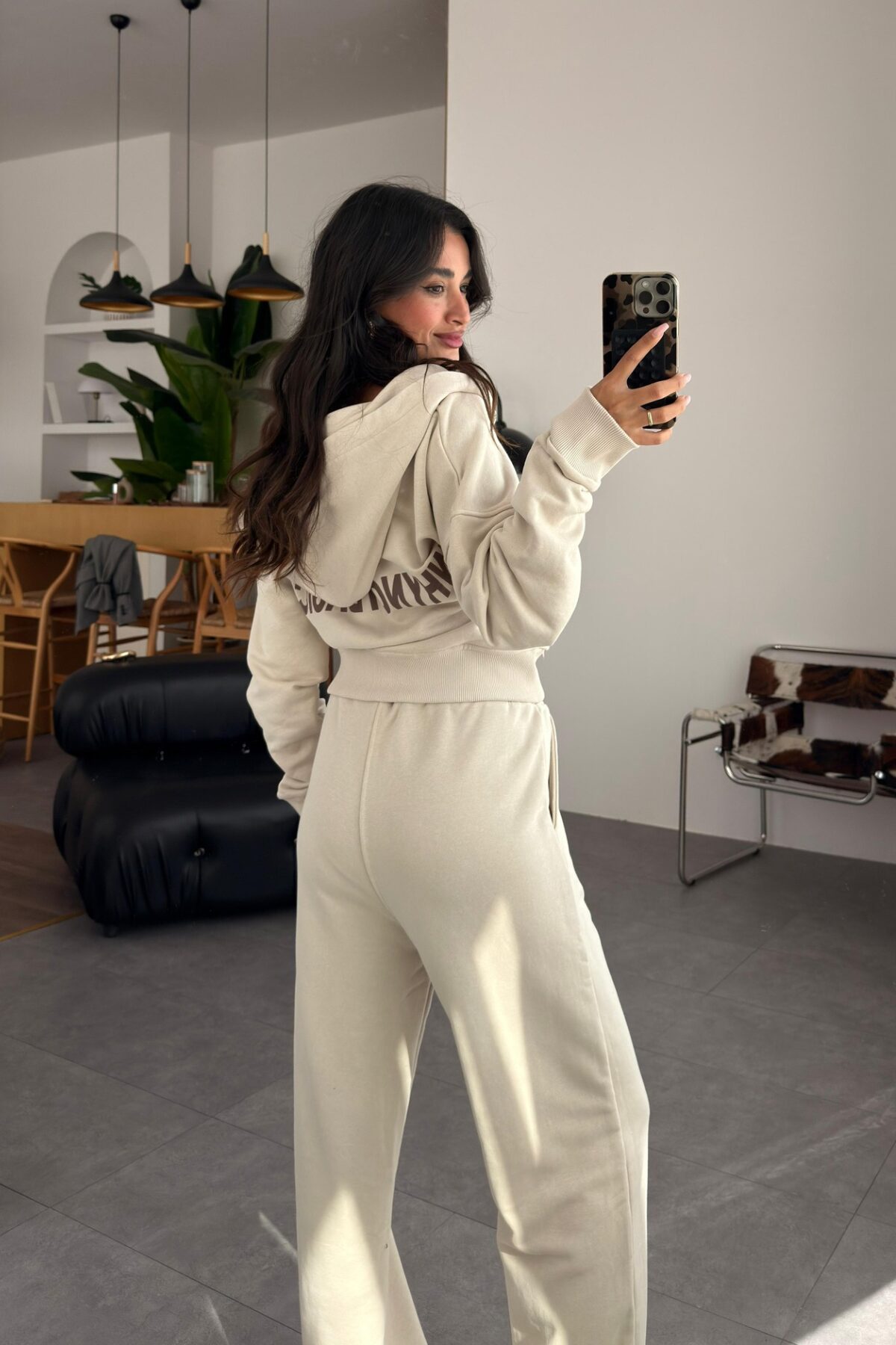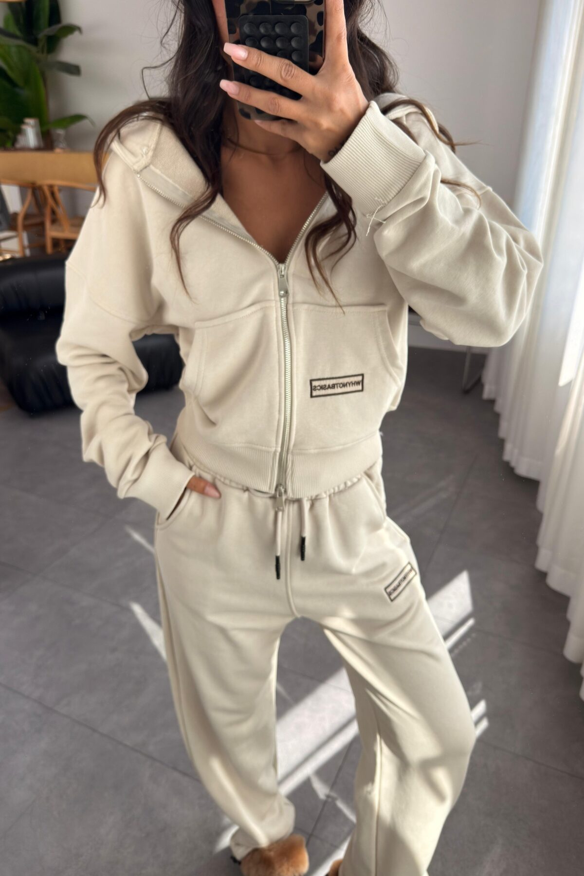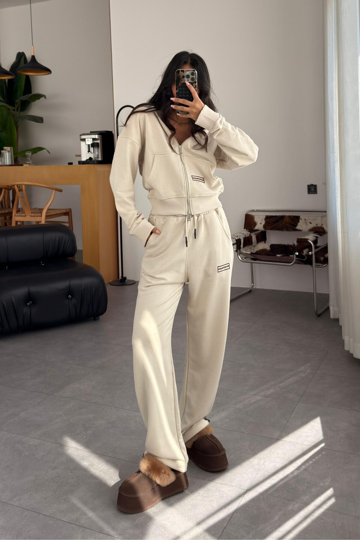 Kapşonlu Hırka Paçası Ayarlanabilir Eşofman Takım Bej