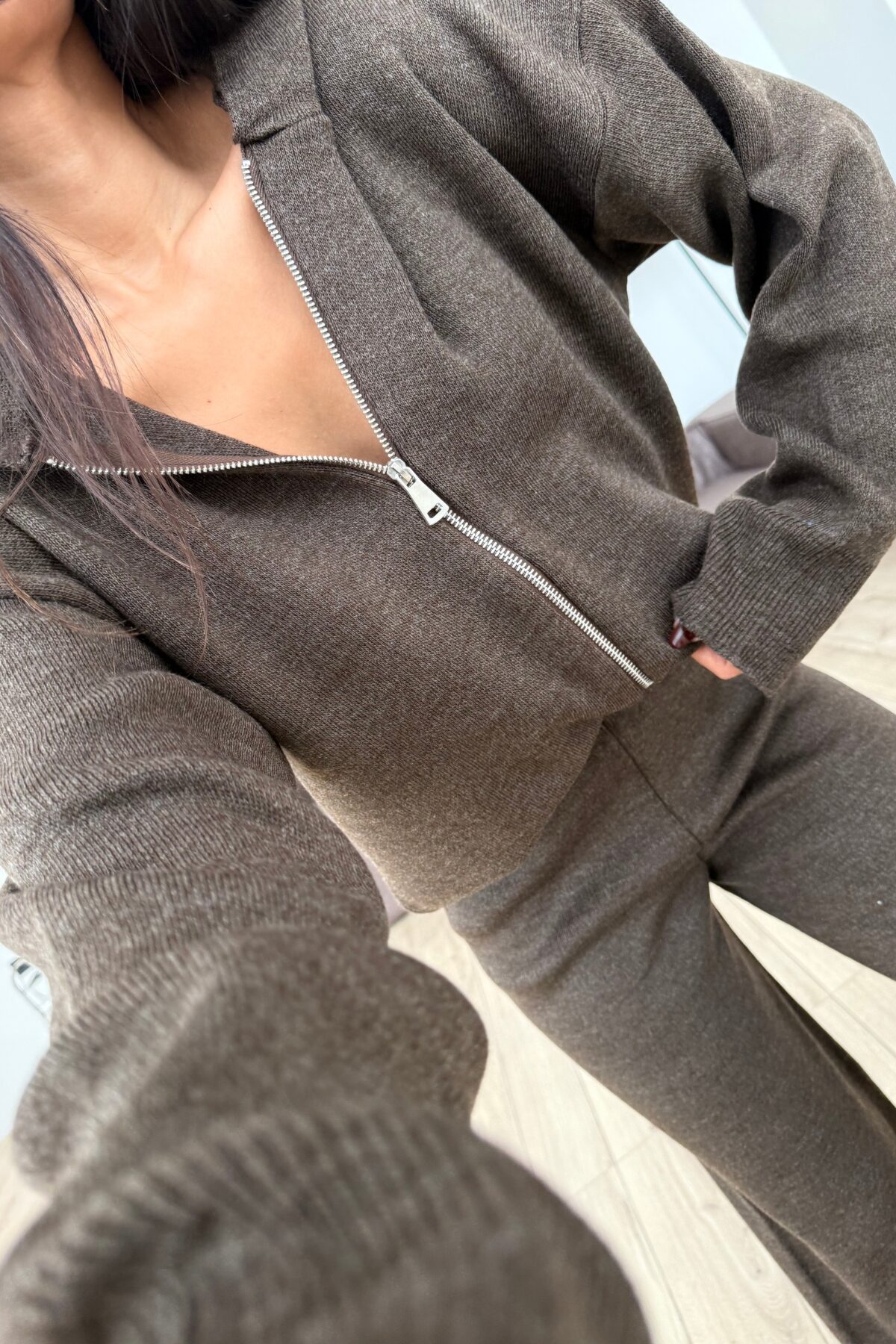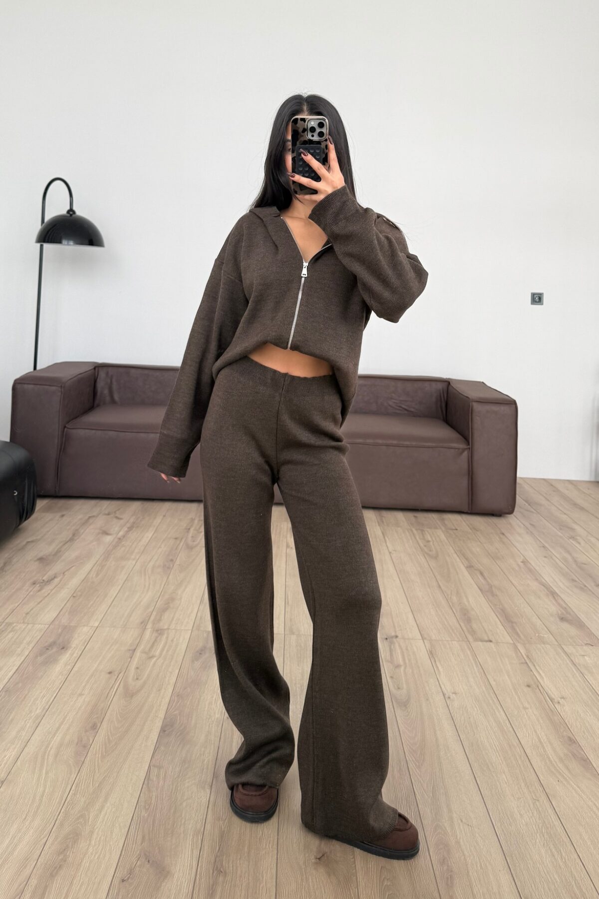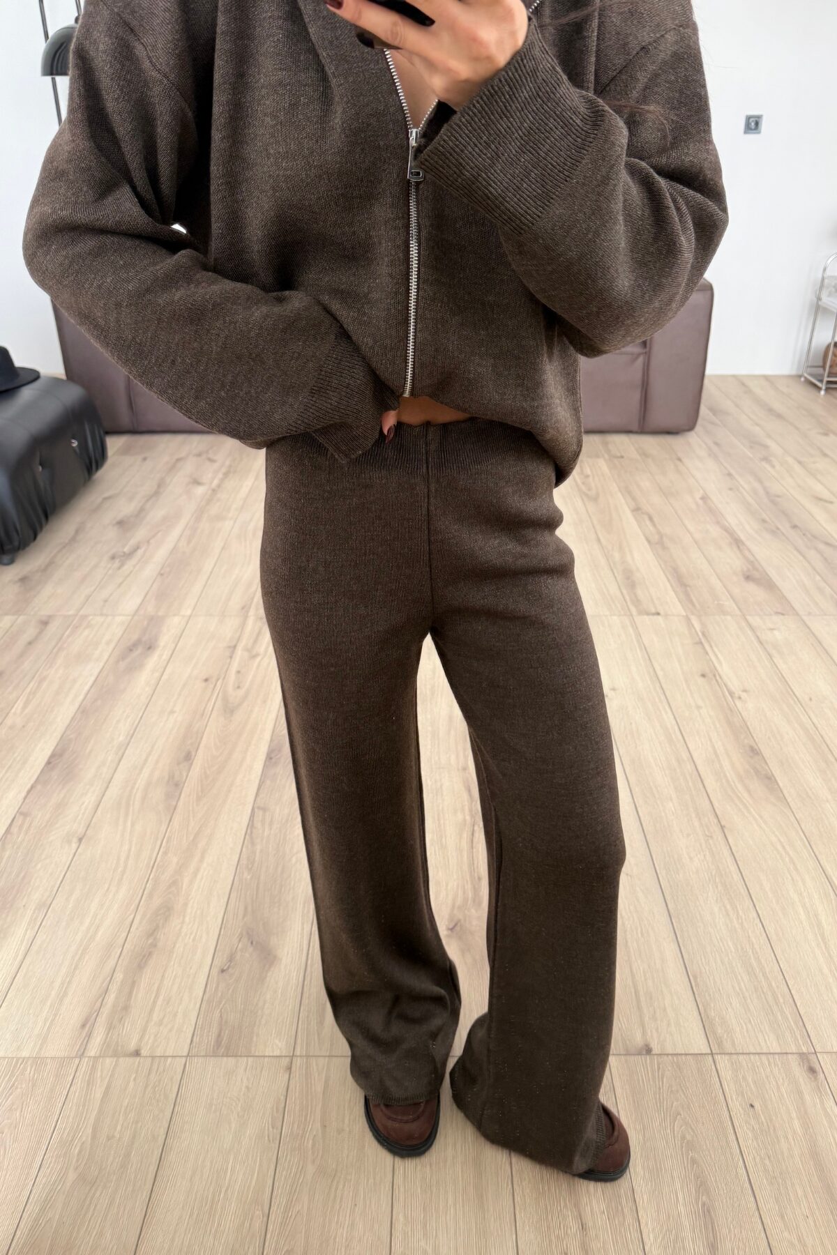 Kapşonlu Triko Hırka Pantolon Takım Kahverengi