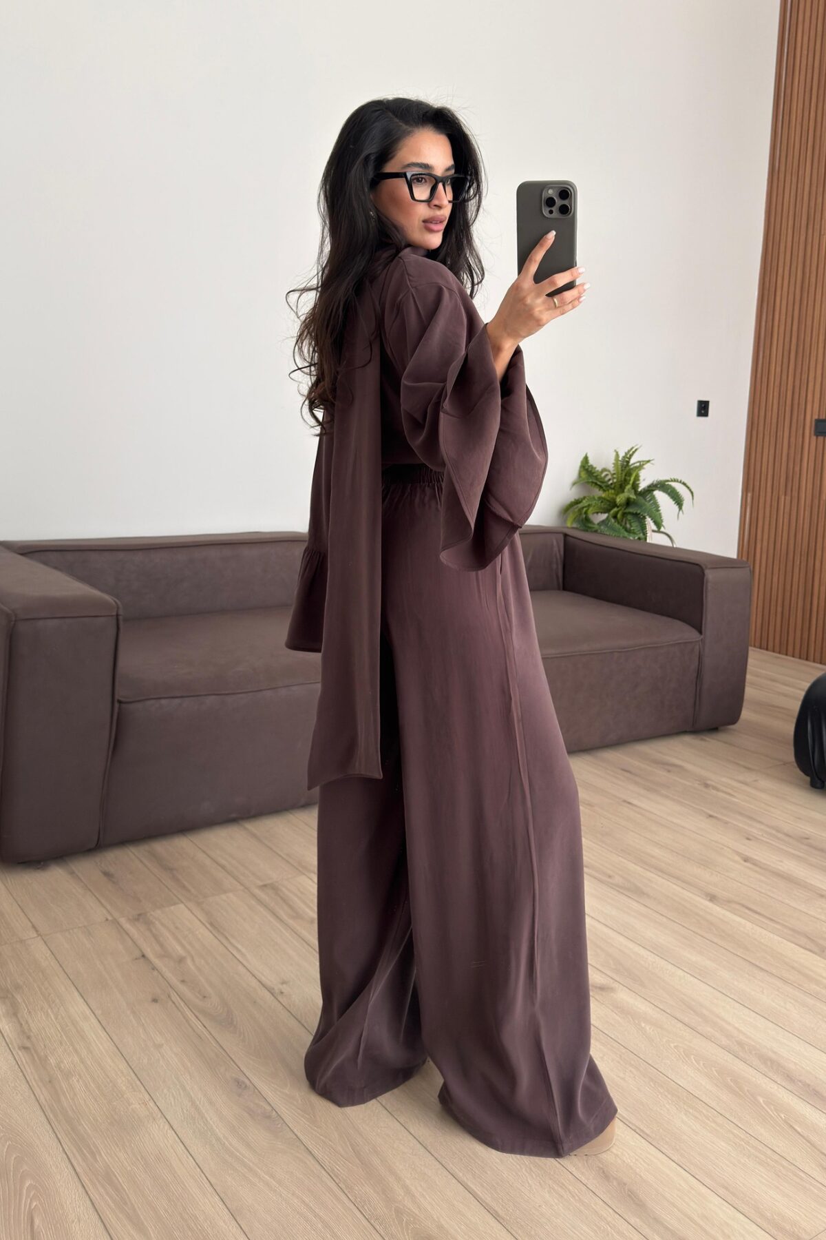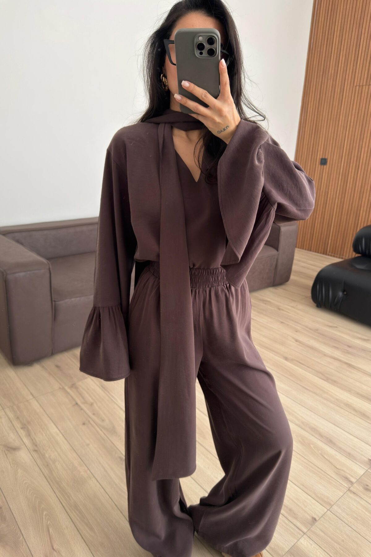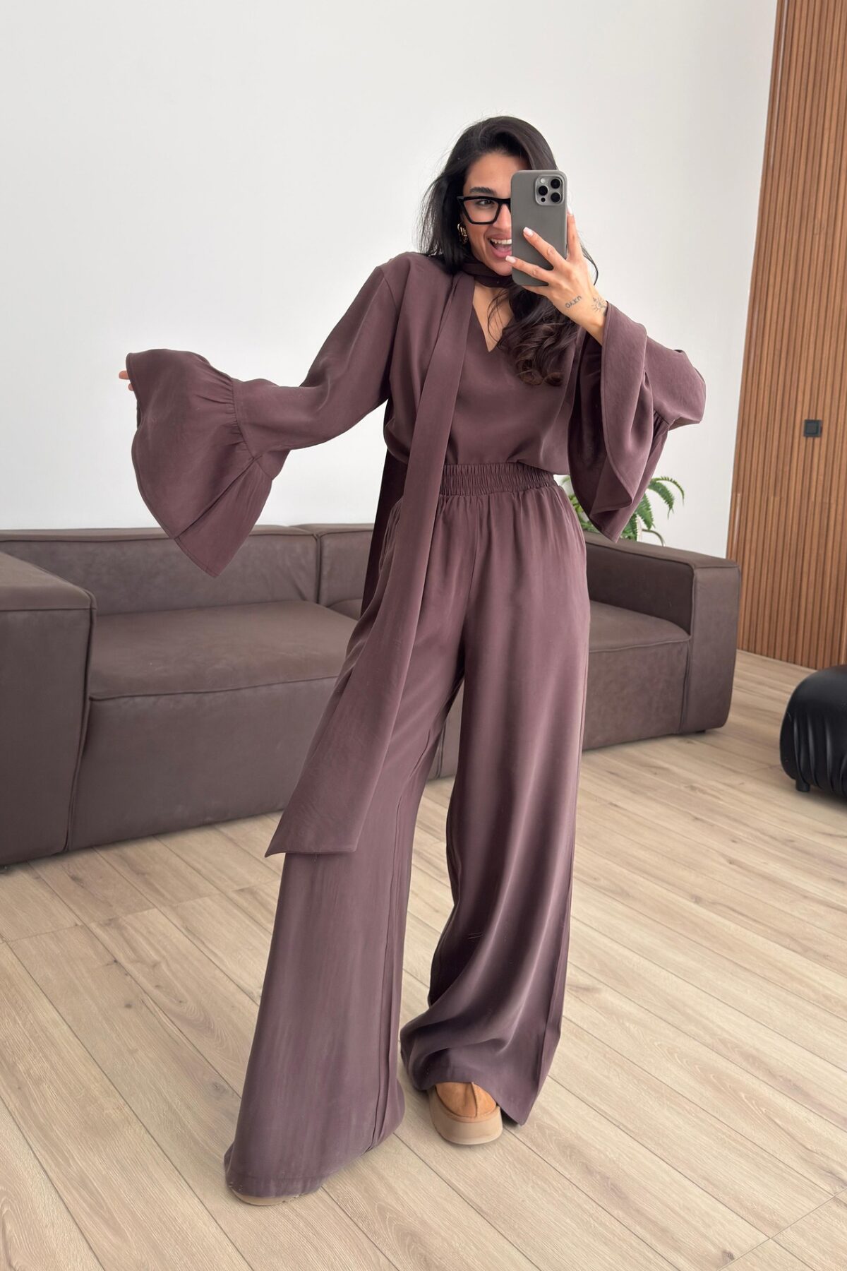 Kolları Volanlı V Yaka Pantolon Takım Kahverengi