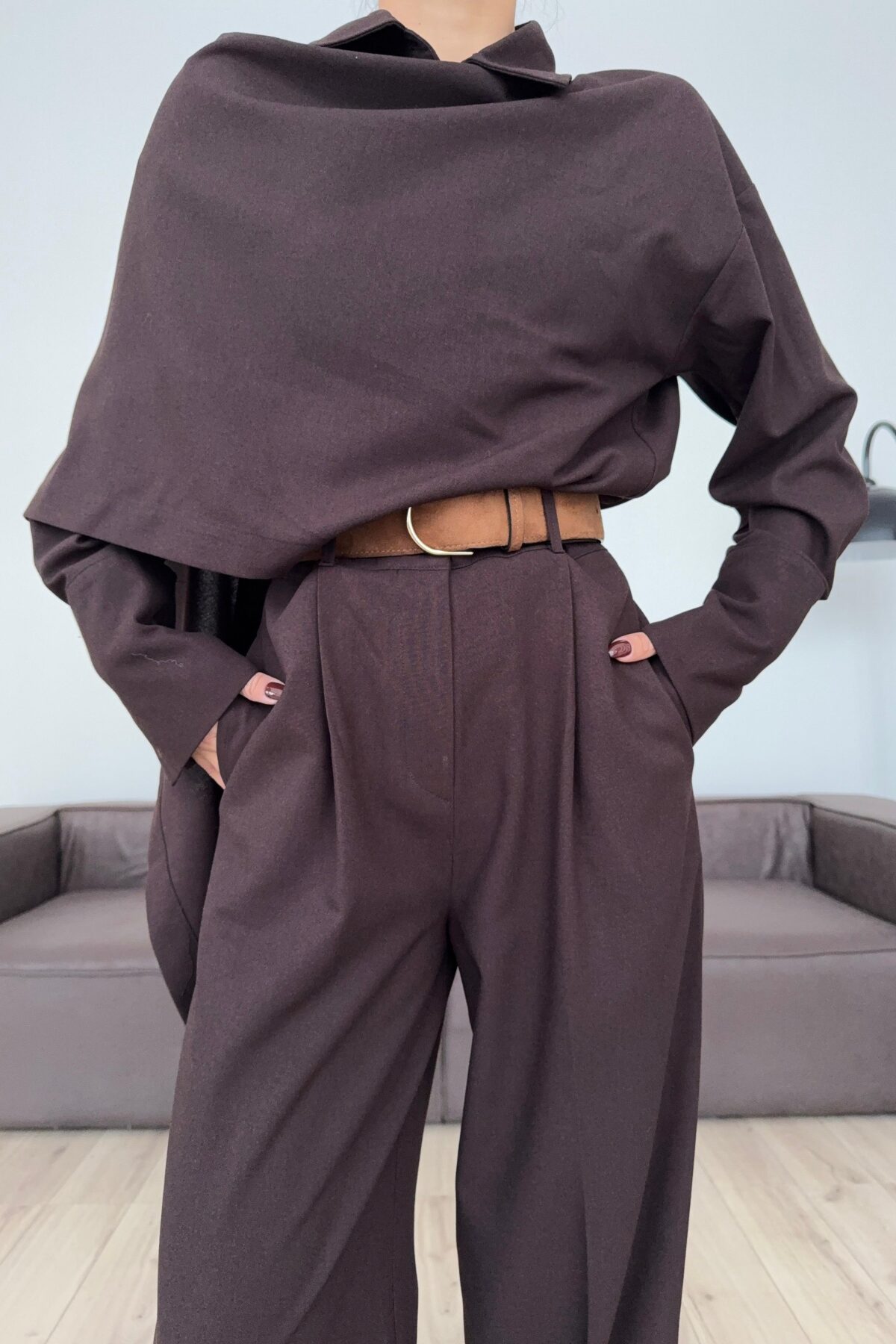 Manşet Kol Yakası Şallı Gömlek Takım Acı Kahve