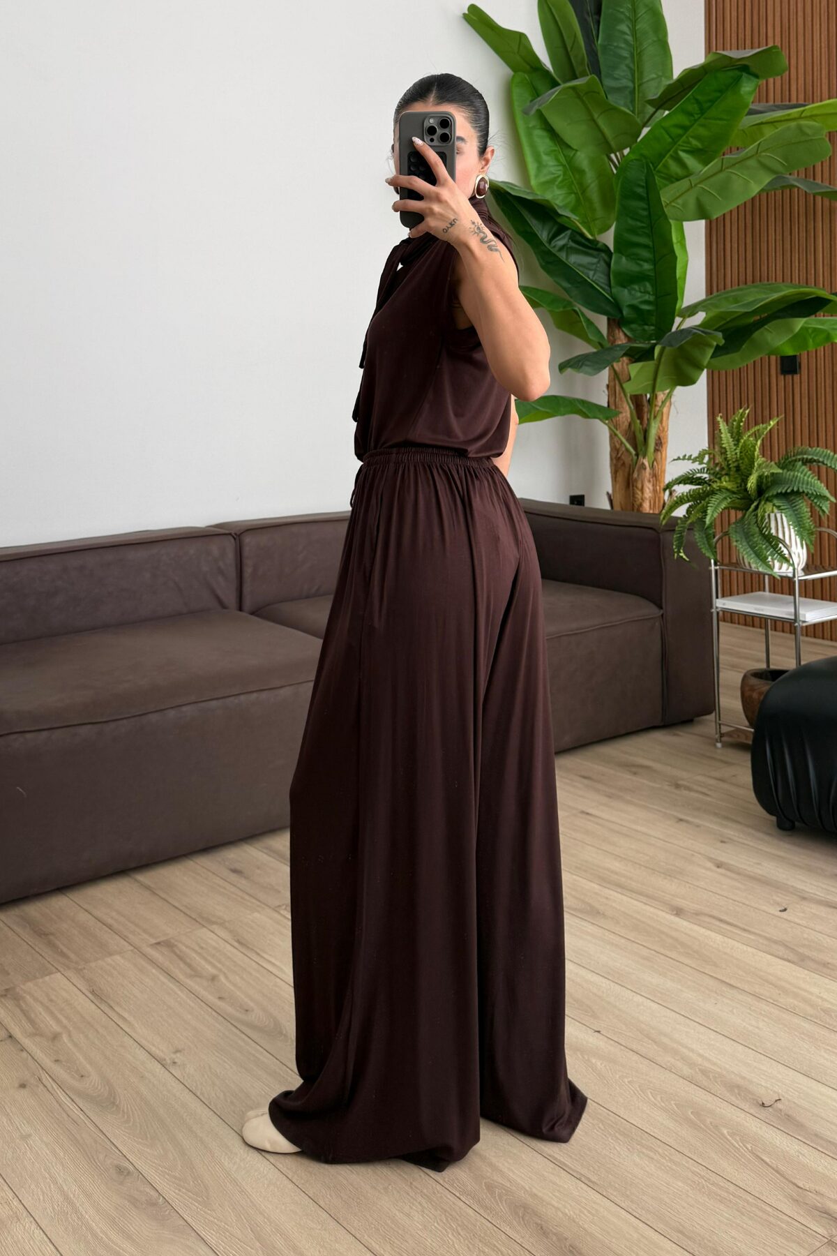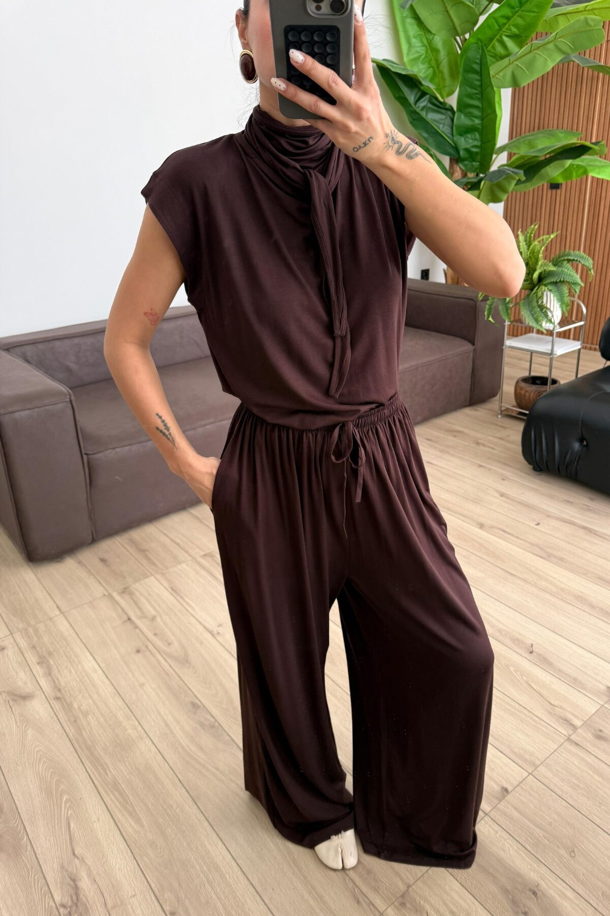 Merlin Bağlamalı Crop Pantolon Takım Kahverengi