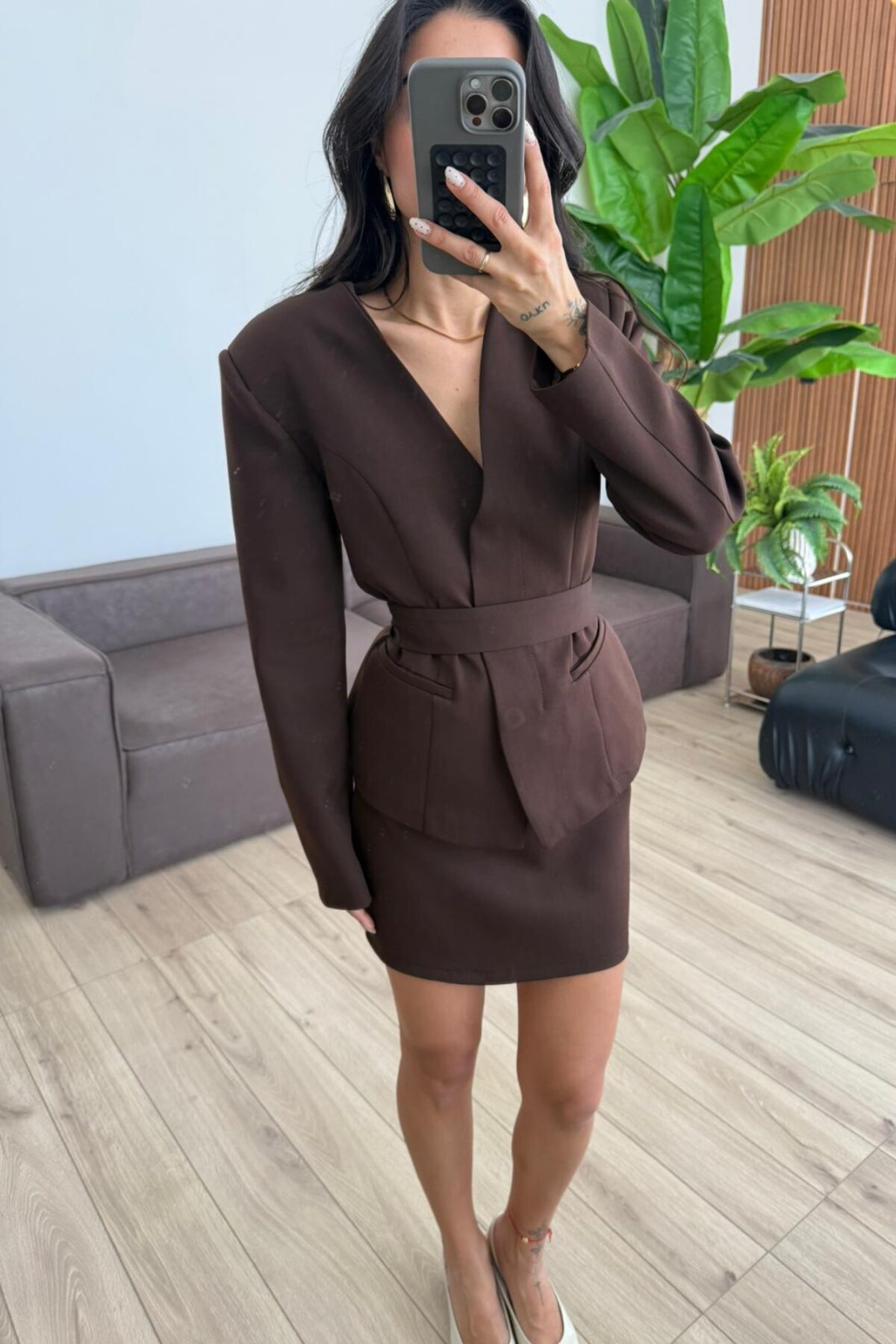 Nesh Yakasız Ceket Mini Etek Takım Kahverengi