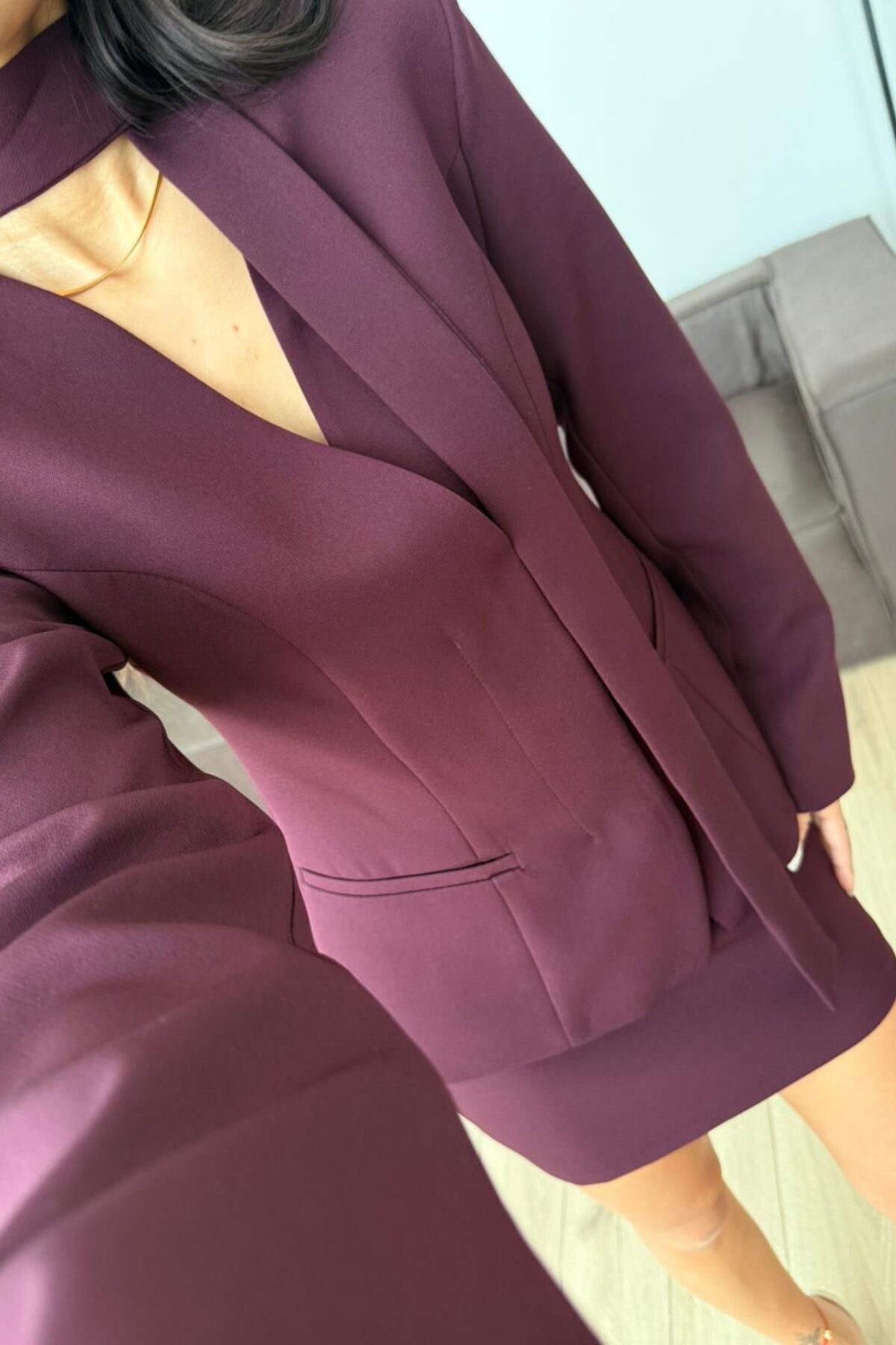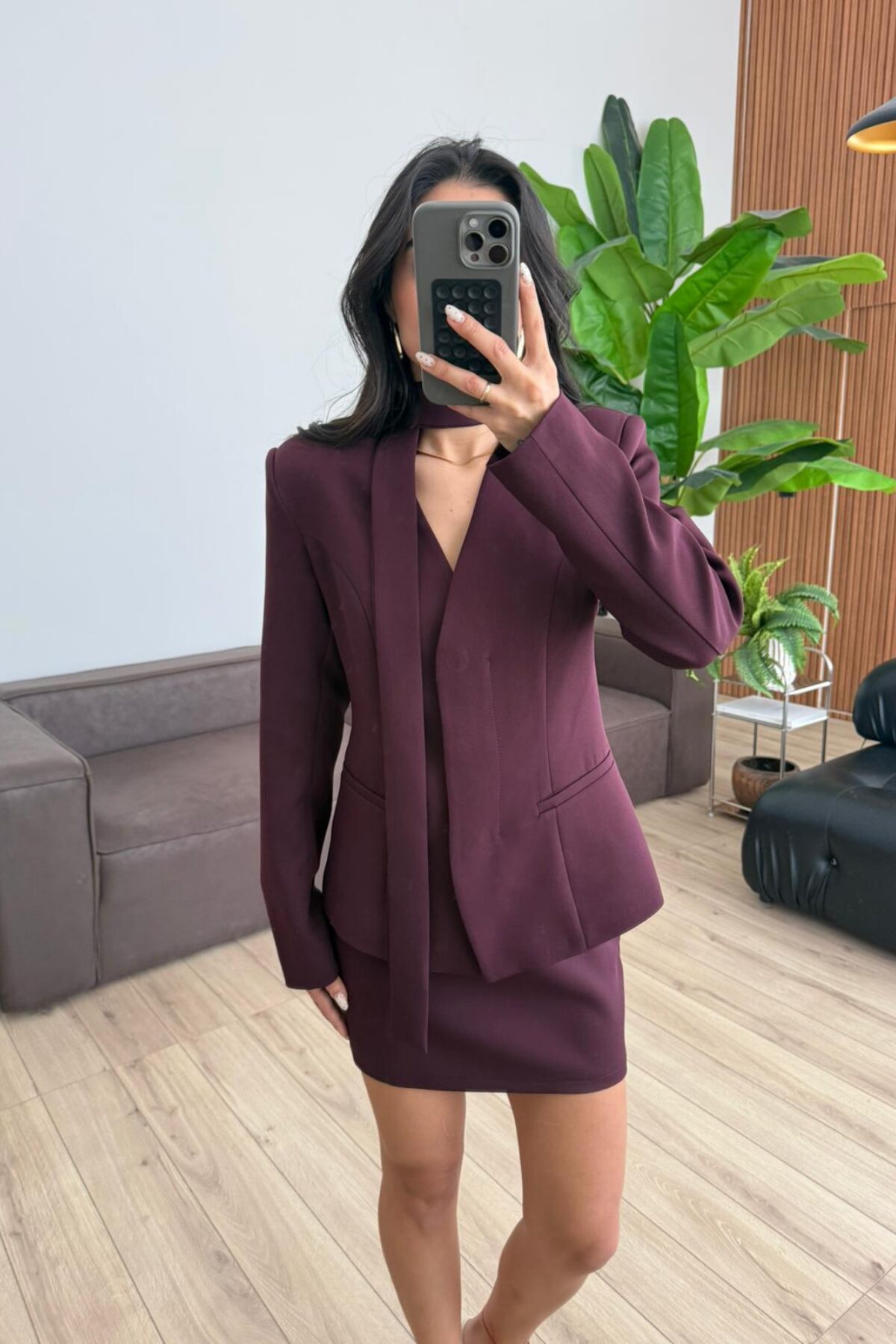 Nesh Yakasız Ceket Mini Etek Takım Mürdüm