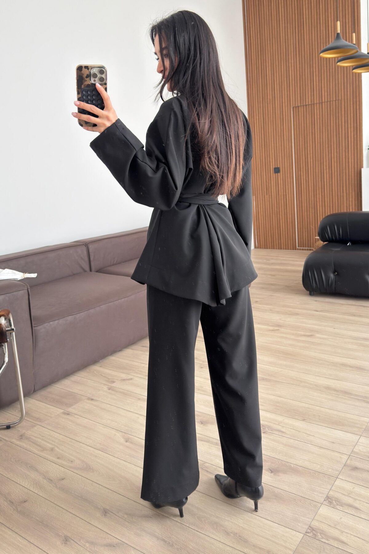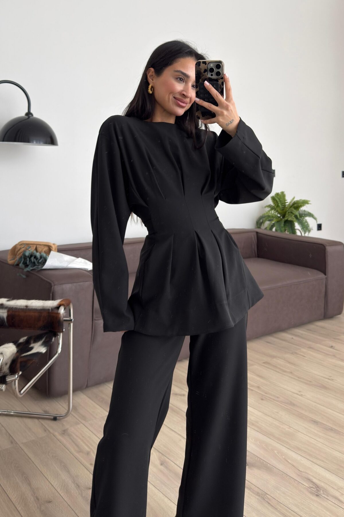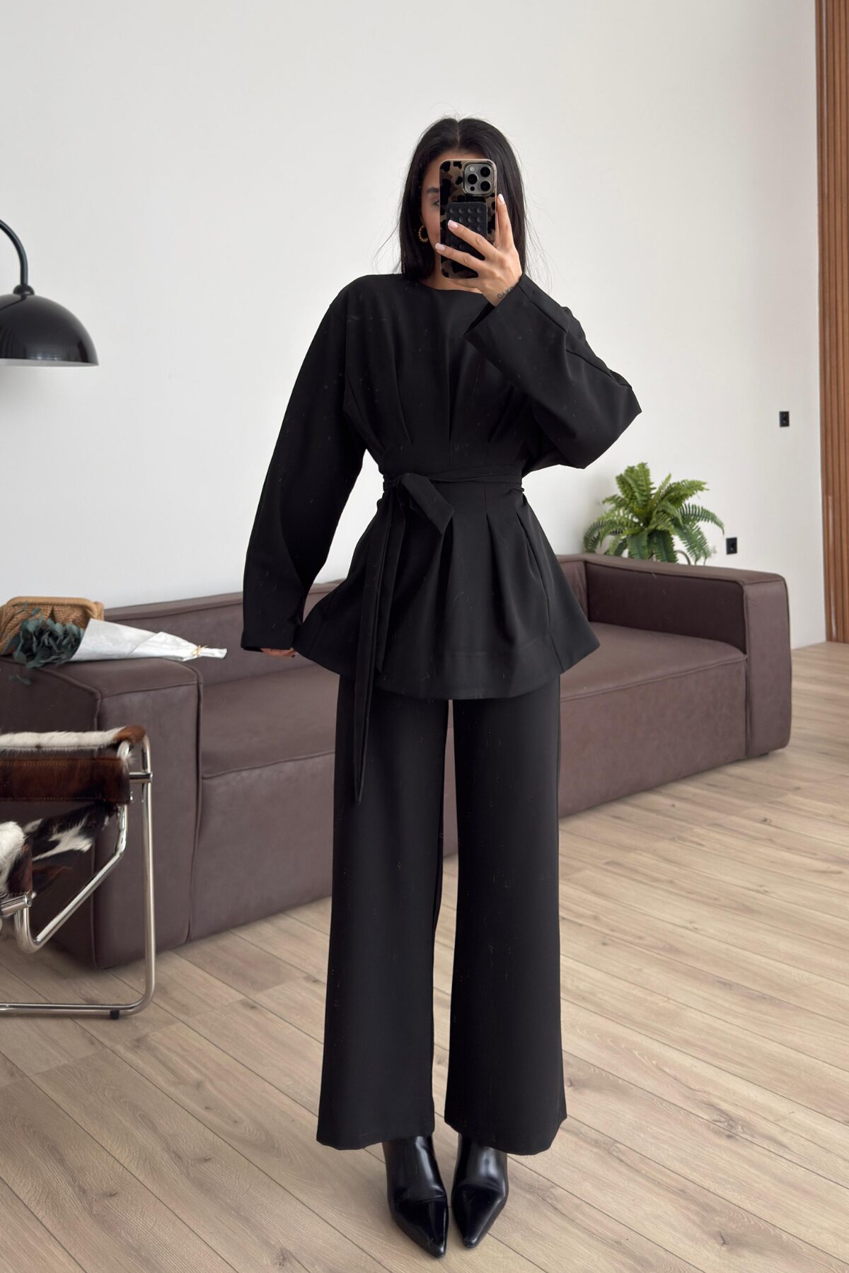Önü Bağlamalı Pileli Takım Siyah