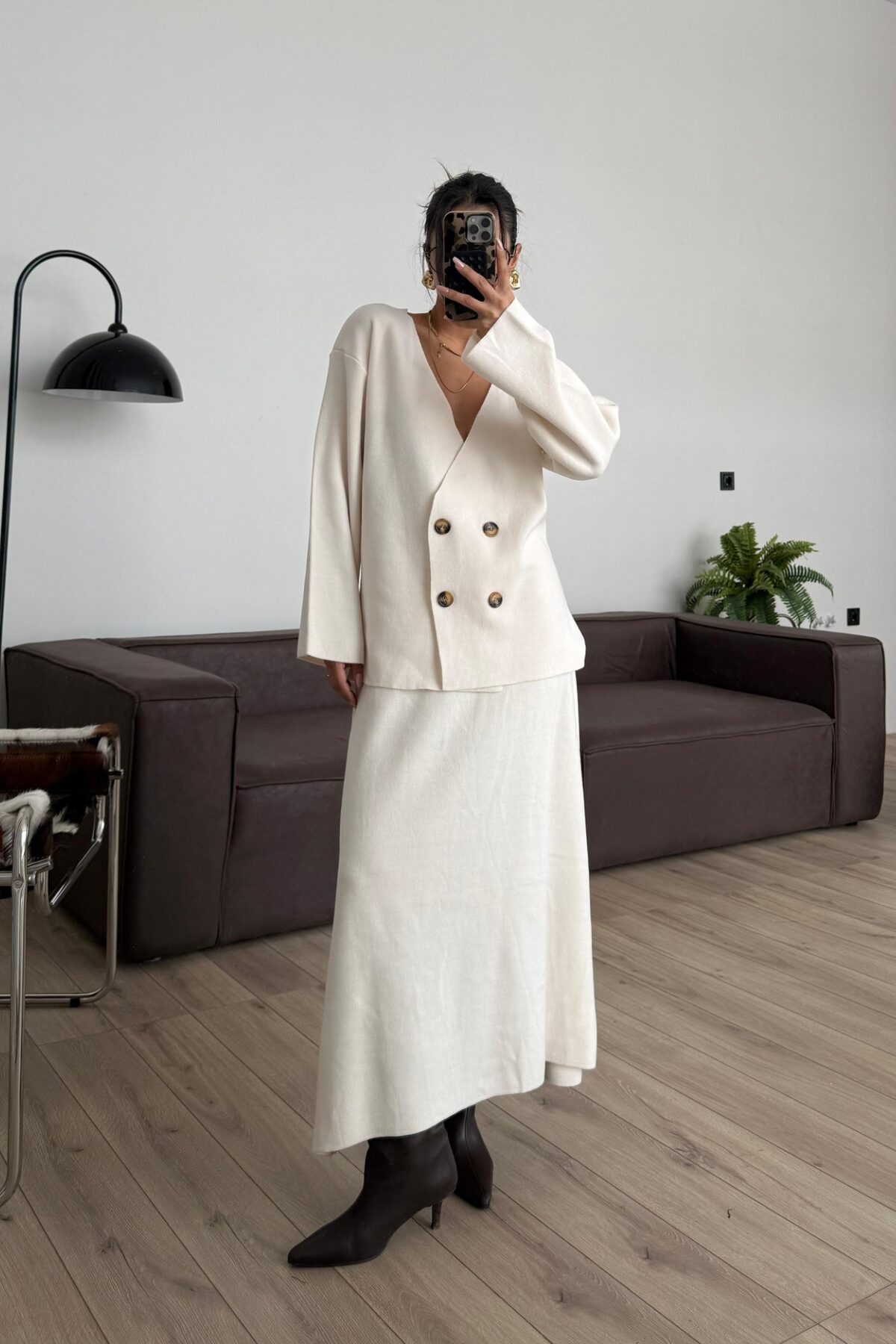 Önü Düğmeli V Yaka Triko Takım Bej