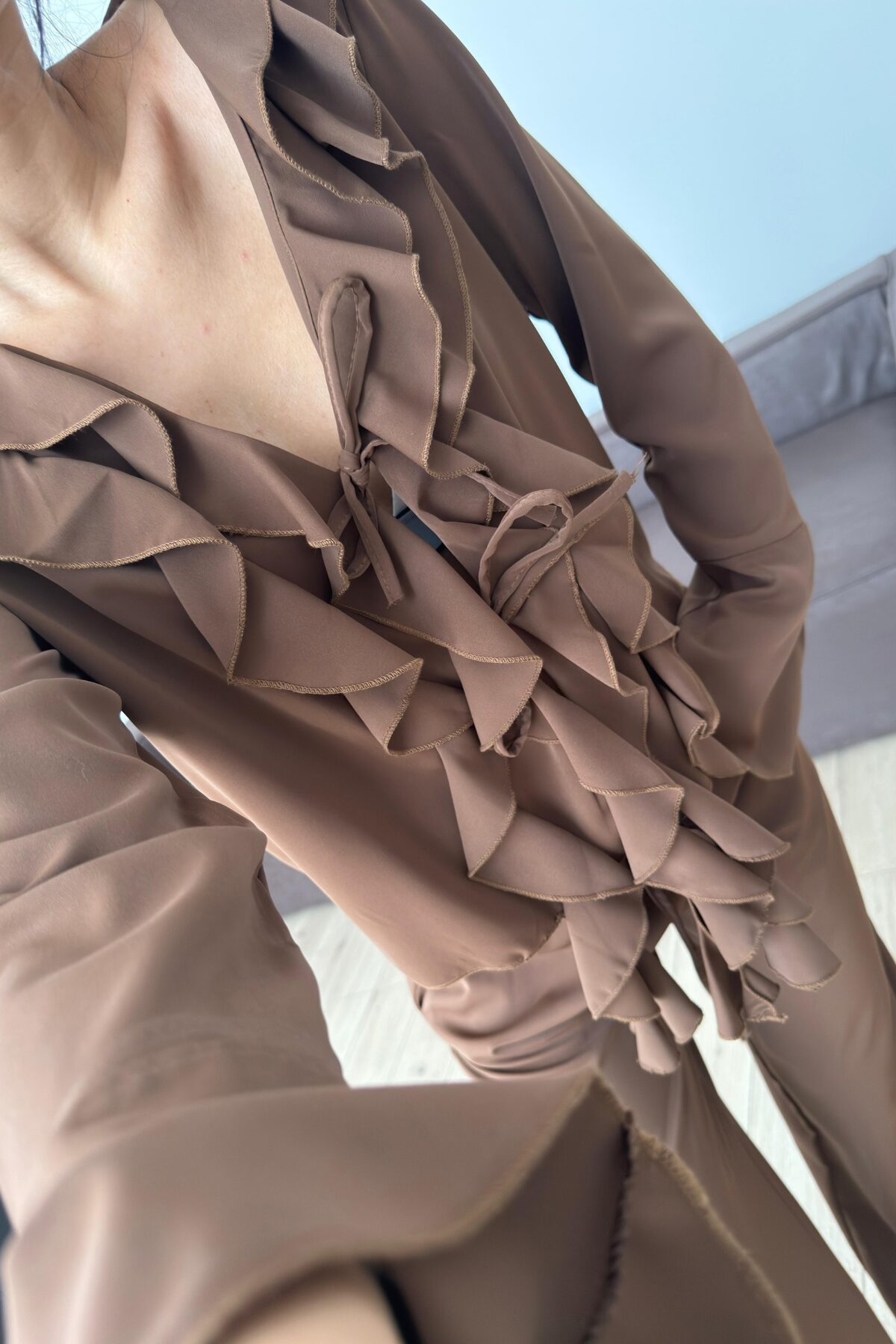 Önü Fırfırlı Kolları Volanlı Pantolon Takım Kahverengi
