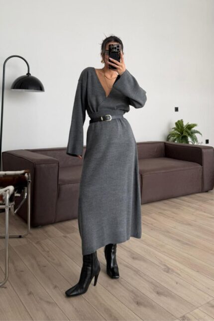 Önü Düğmeli V Yaka Triko Takım Antrasit