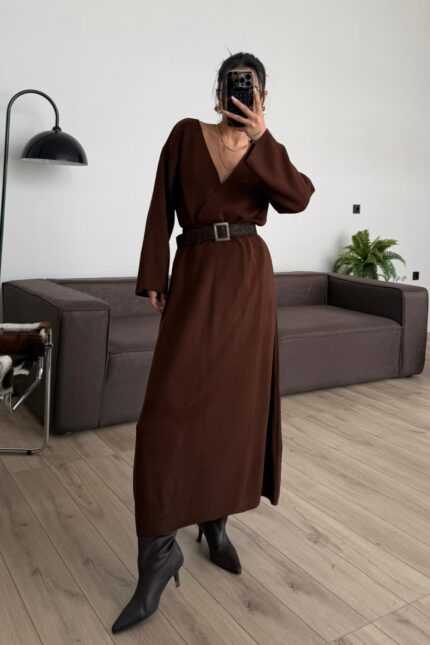Önü Düğmeli V Yaka Triko Takım Kahverengi