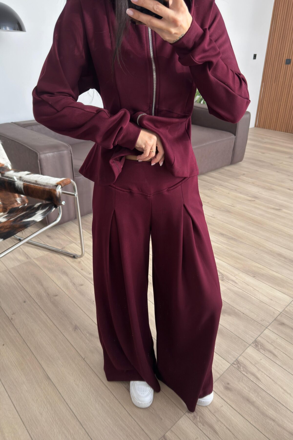 Pantolonu Pileli Bol Paça Hırka Takım Bordo