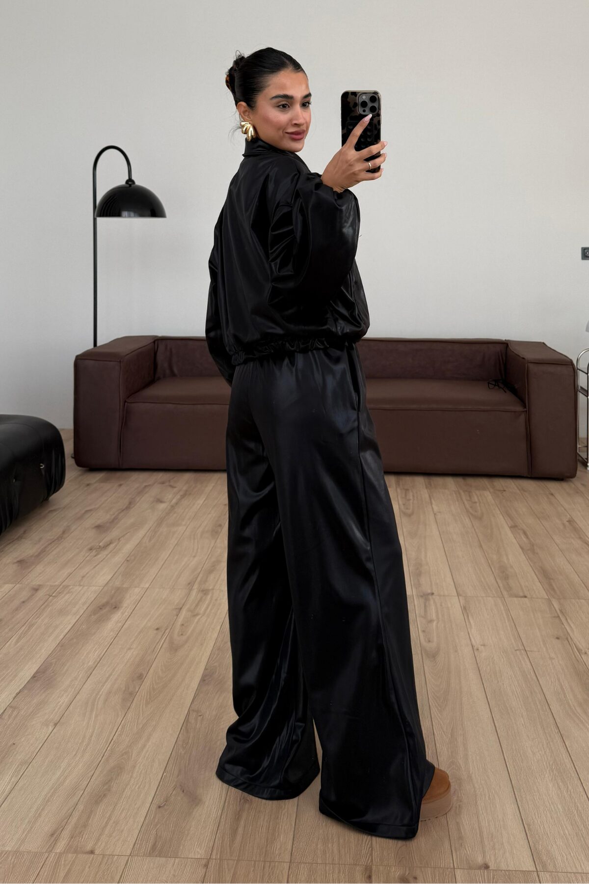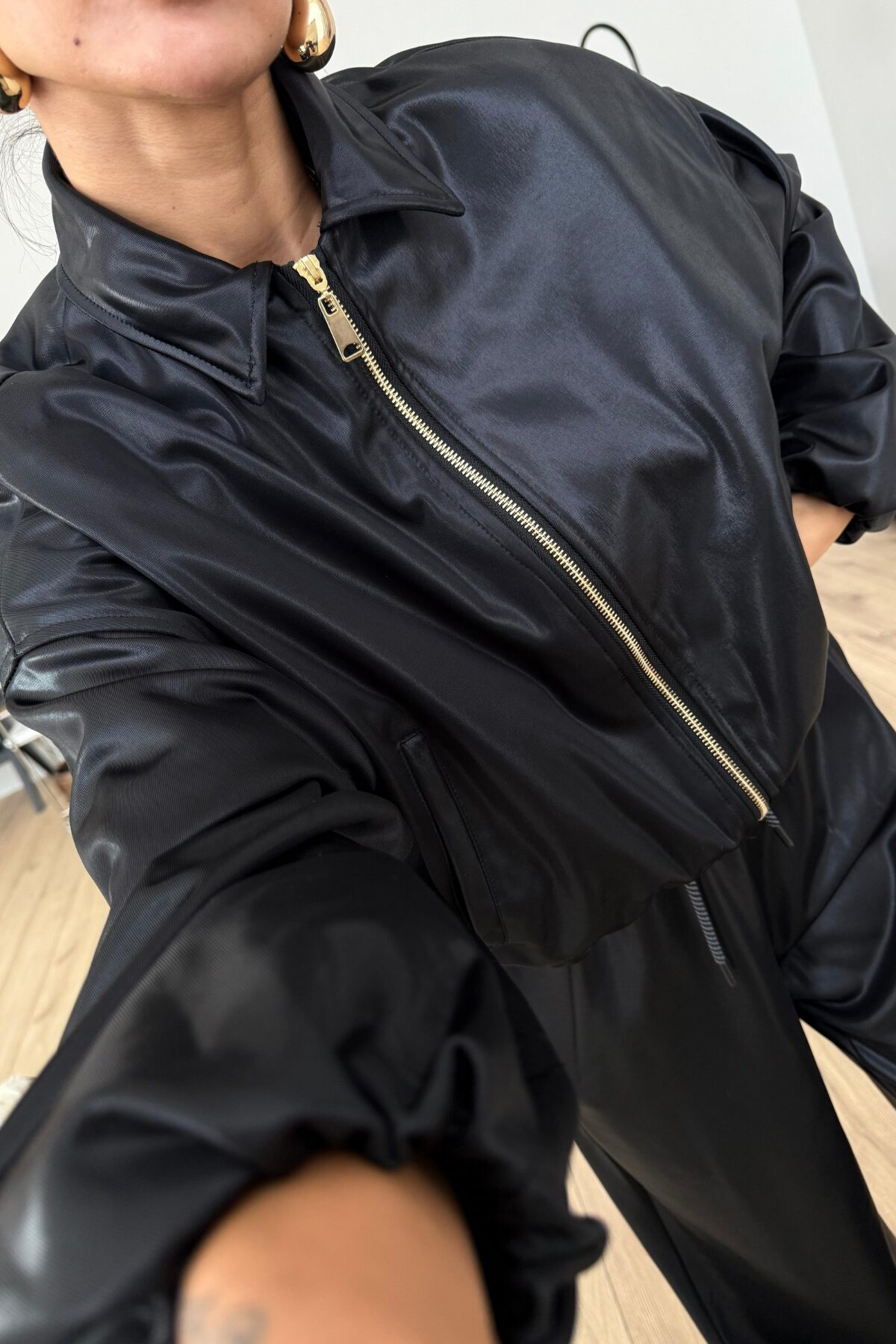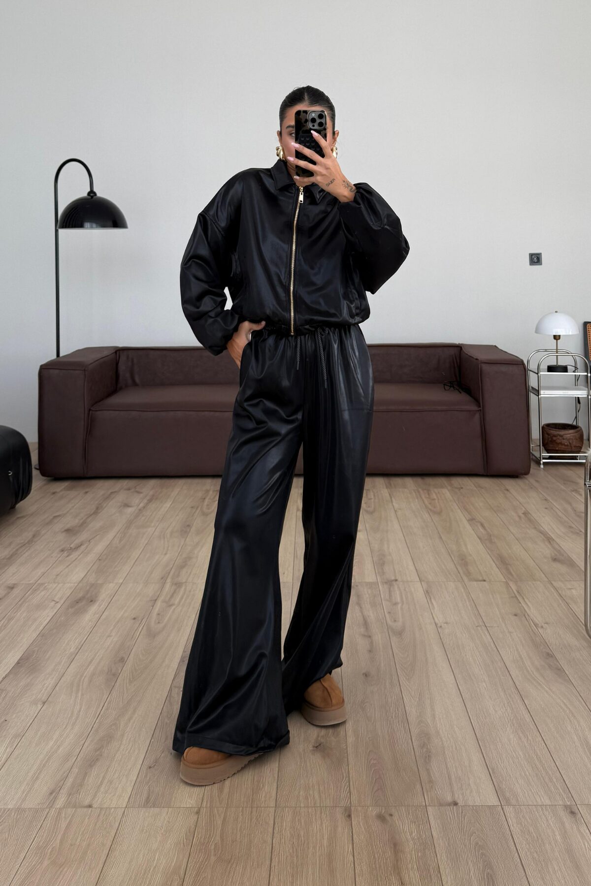Parlak Kumaş Fermuarlı Ceket Takım Siyah