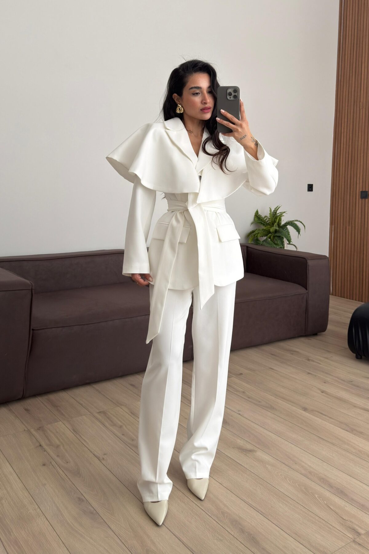 “Pelerinli Parçalı Blazer Takım Ekru” için yorum yapan ilk kişi siz olun
