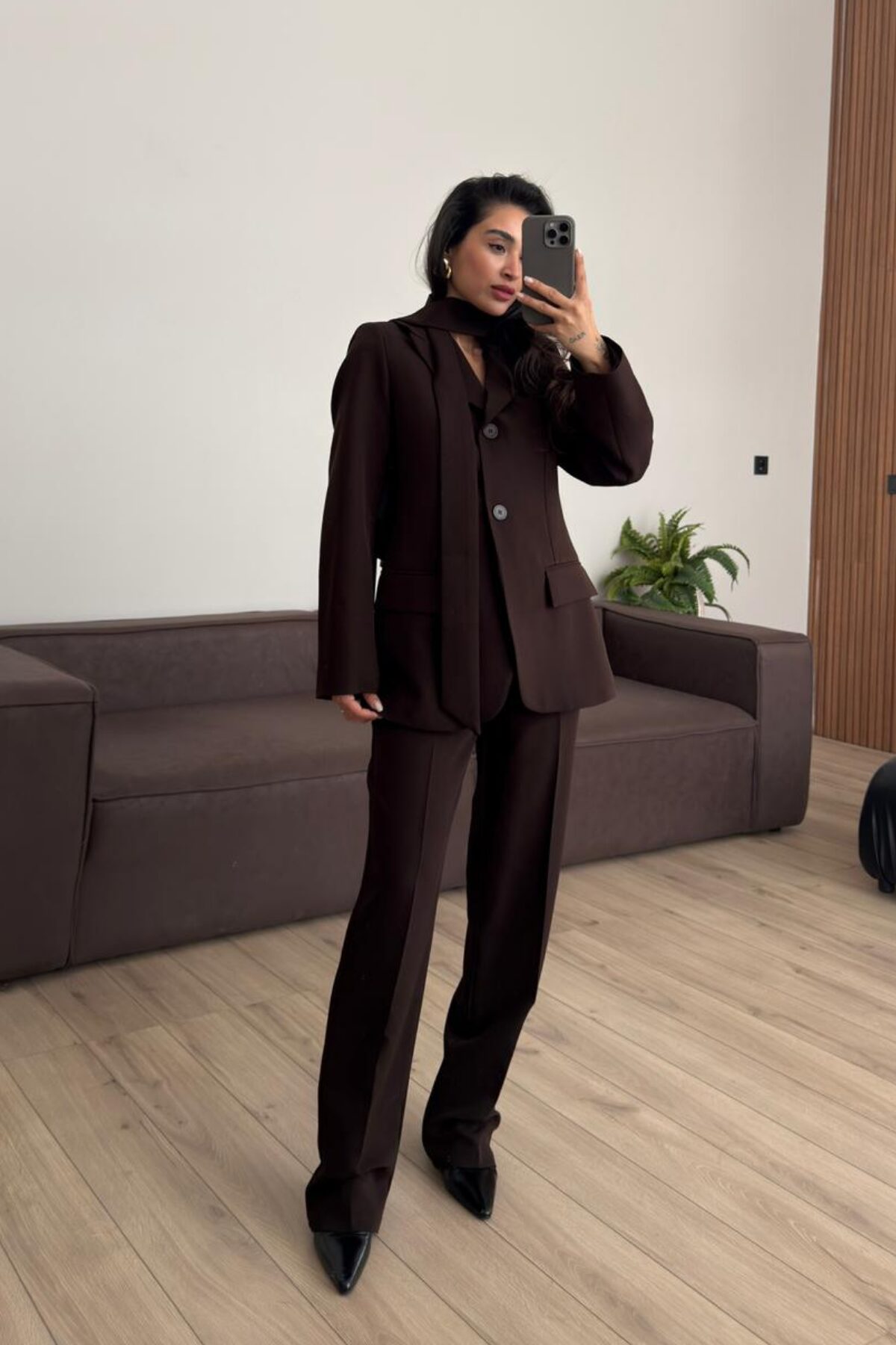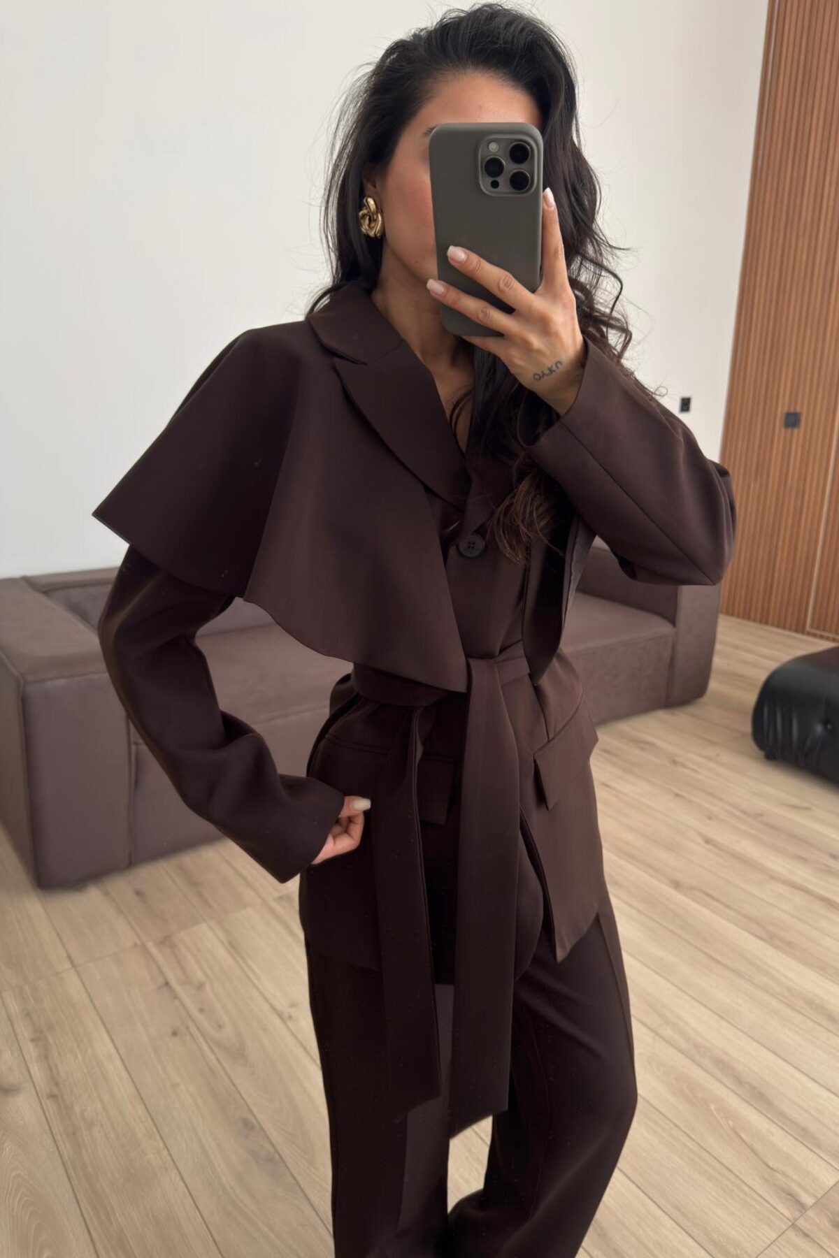 Pelerinli Parçalı Blazer Takım Kahverengi