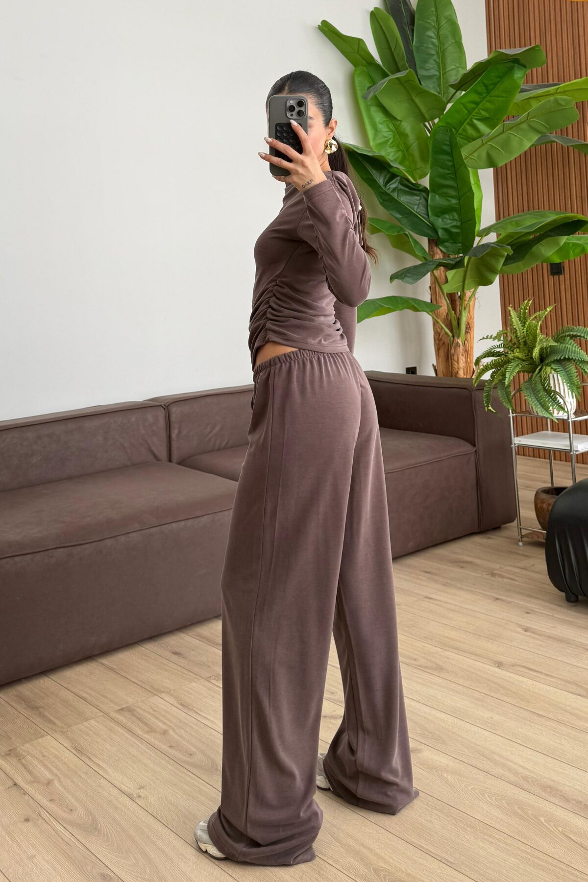 Relax Düşük Omuz Bluz Pantolon Takım Kahverengi