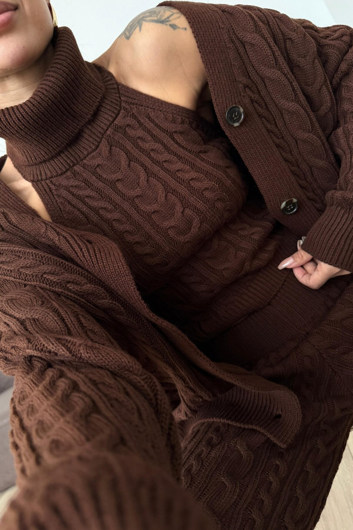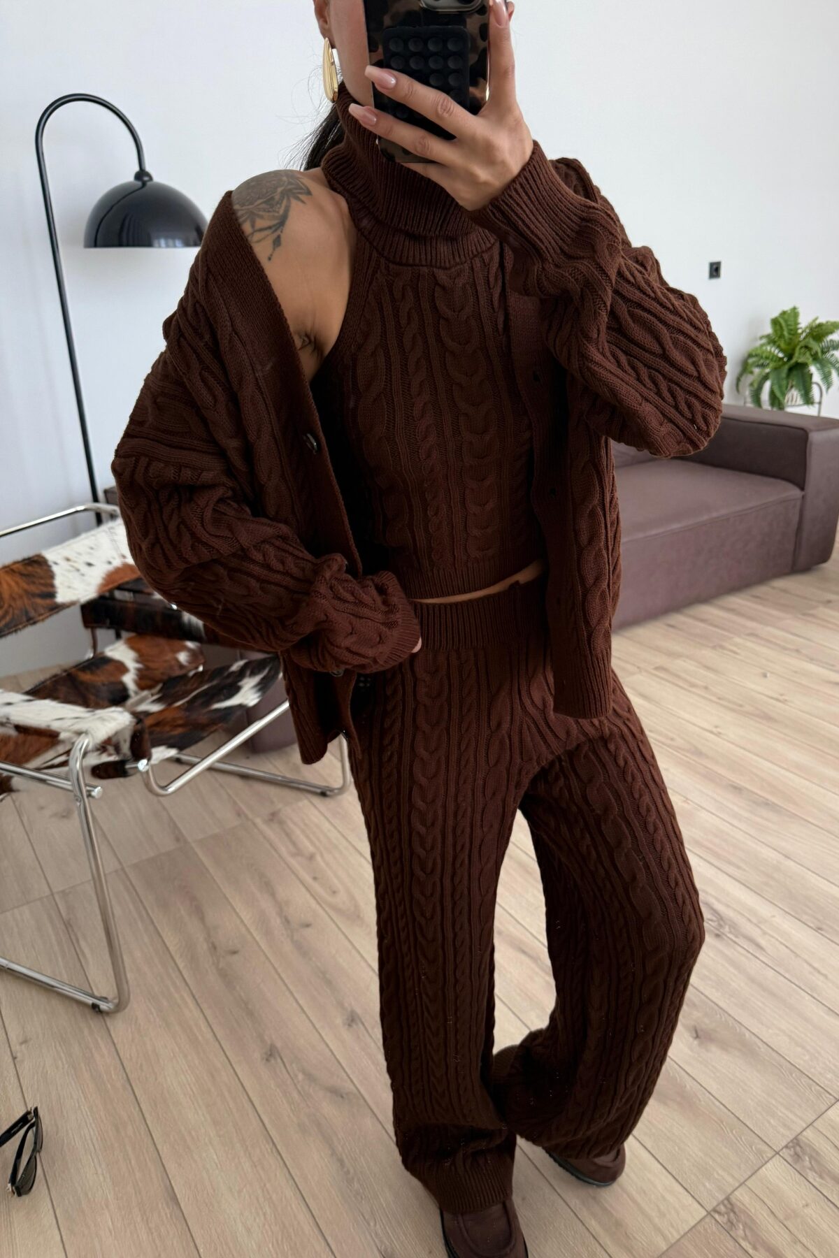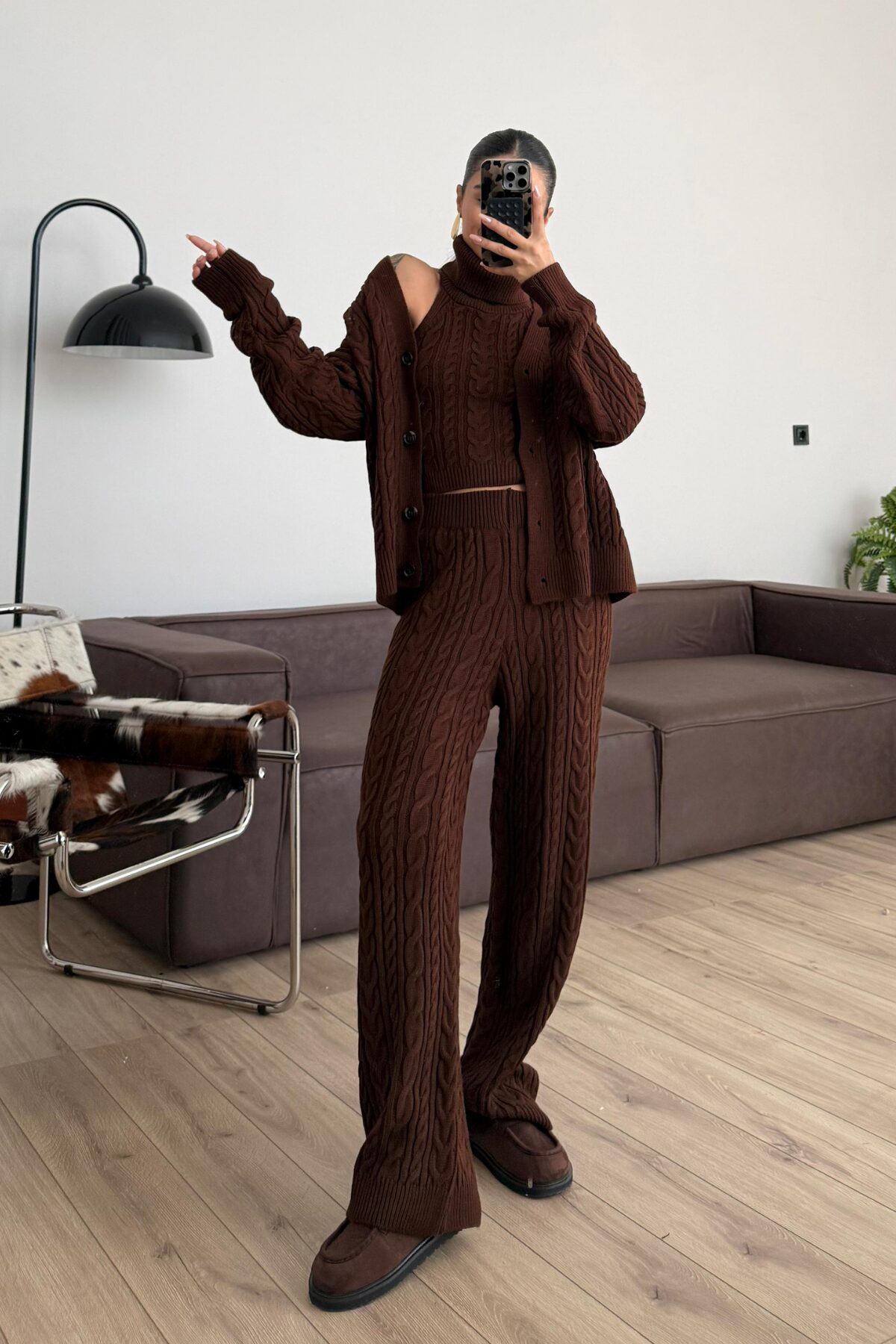 Saç Örgülü 3 Parça Triko Takım Kahverengi