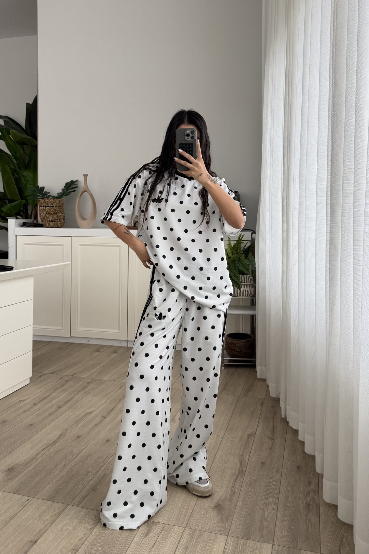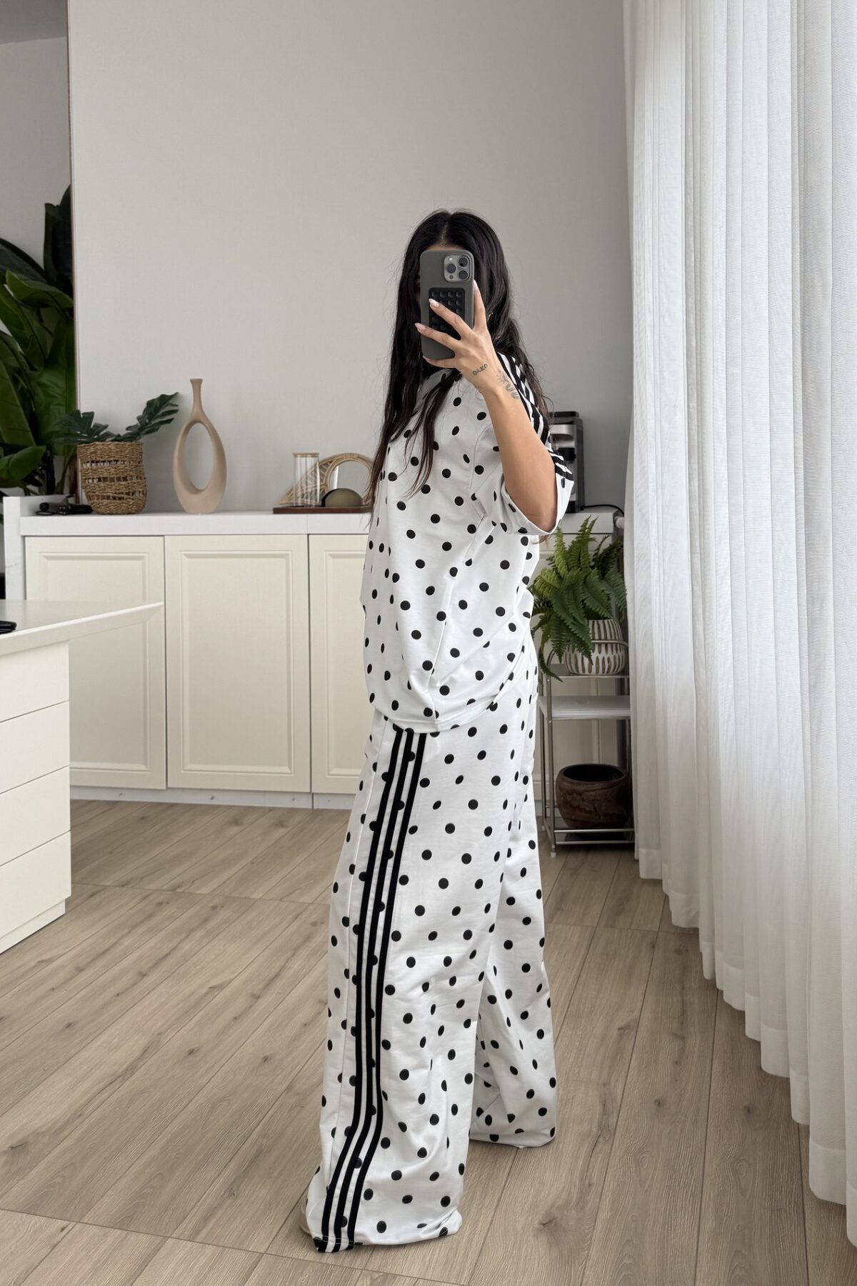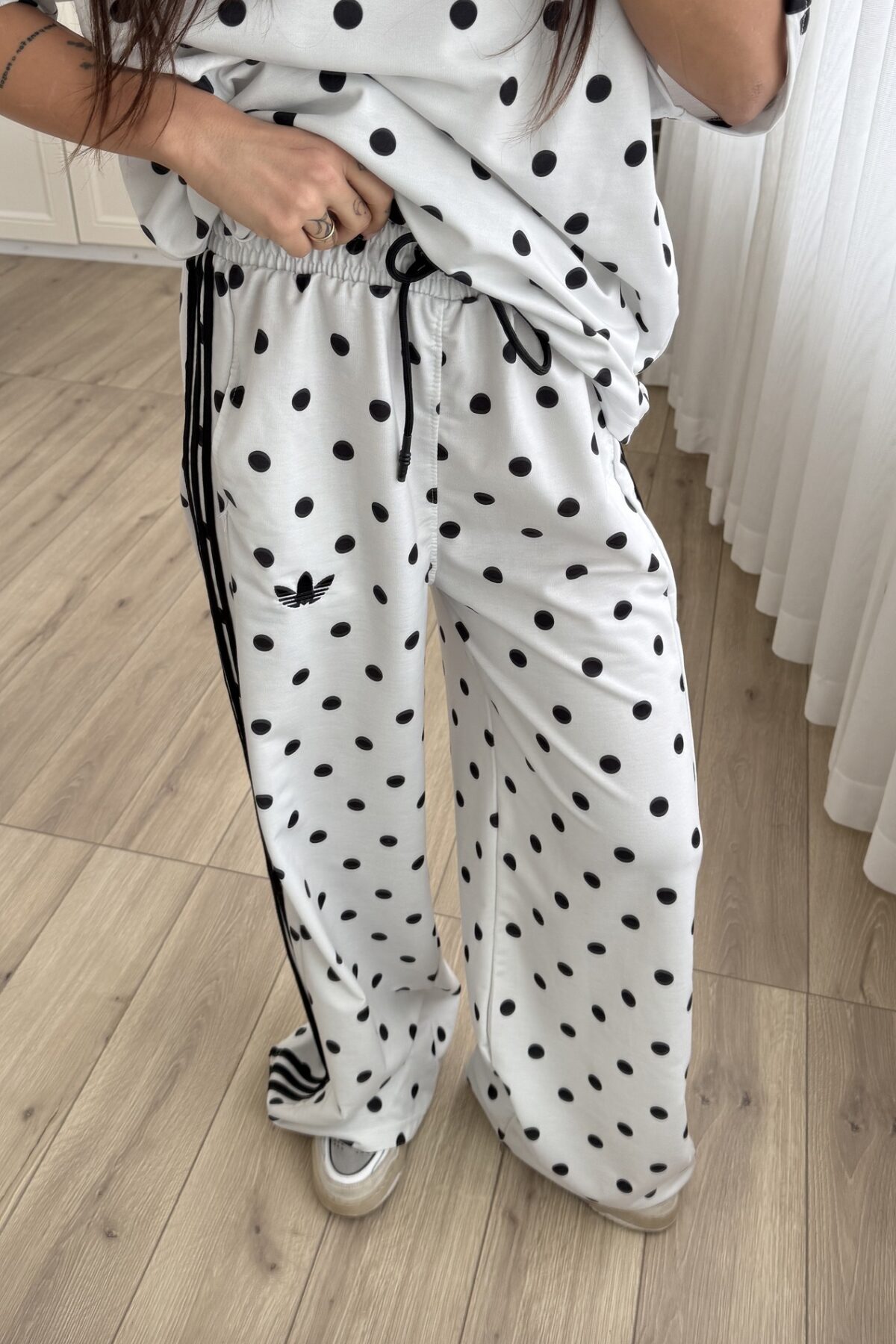 Şeritli Puantiyeli Kısa Kol Eşofman Takım Beyaz