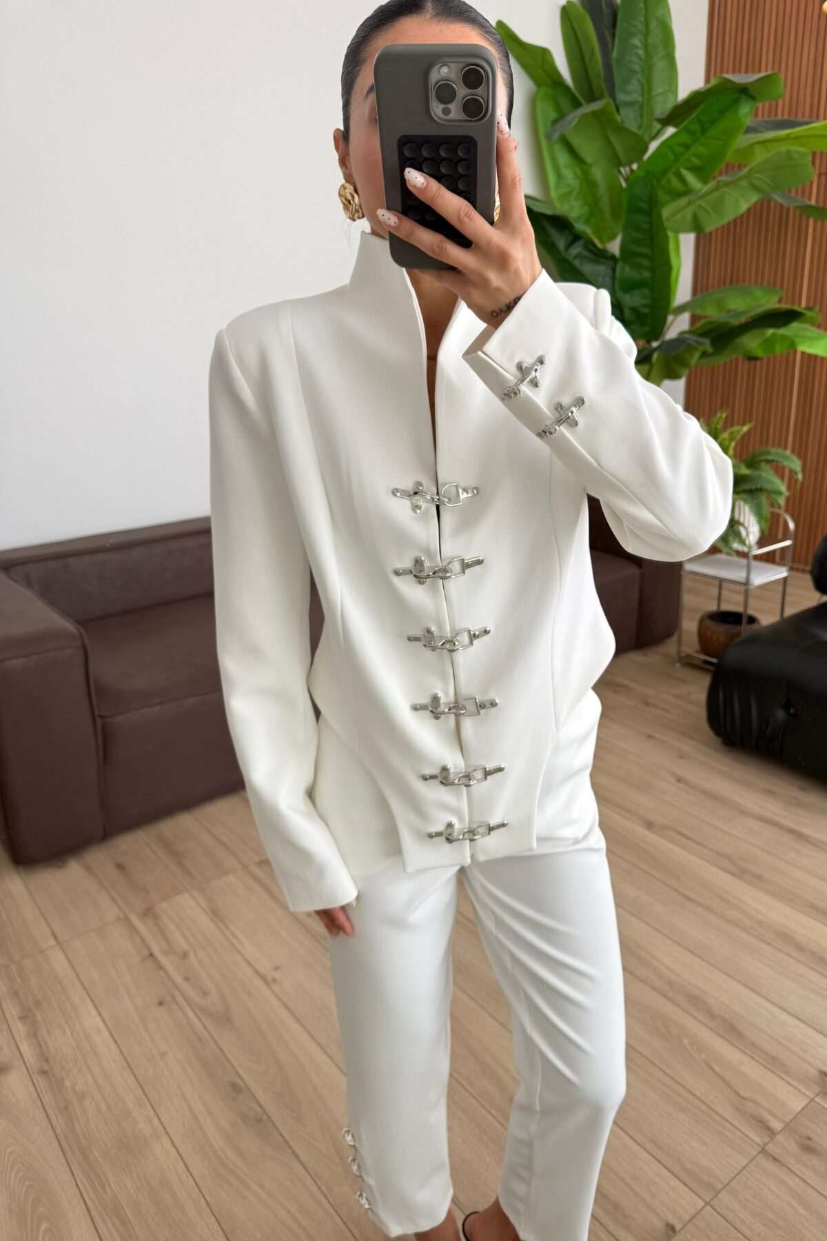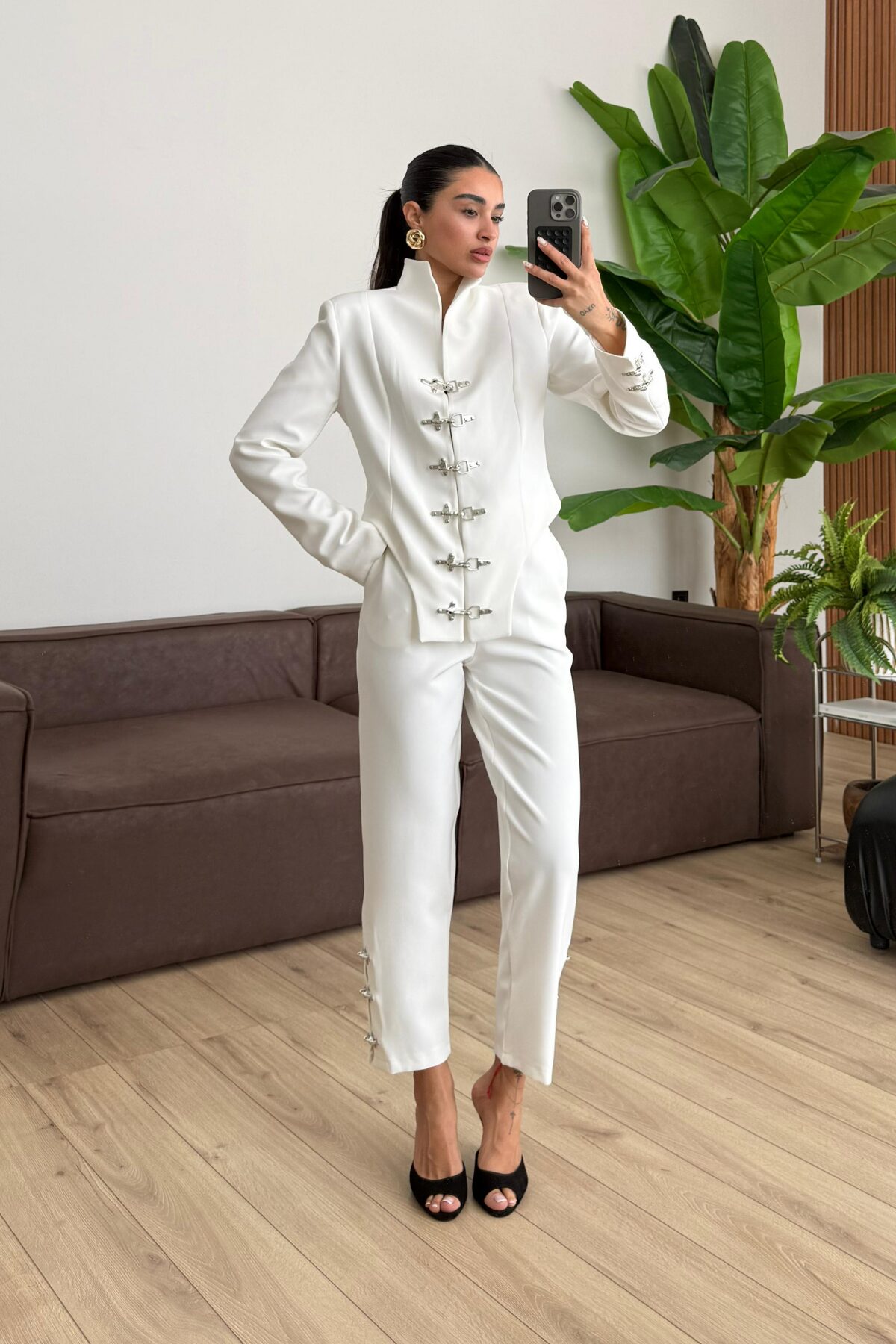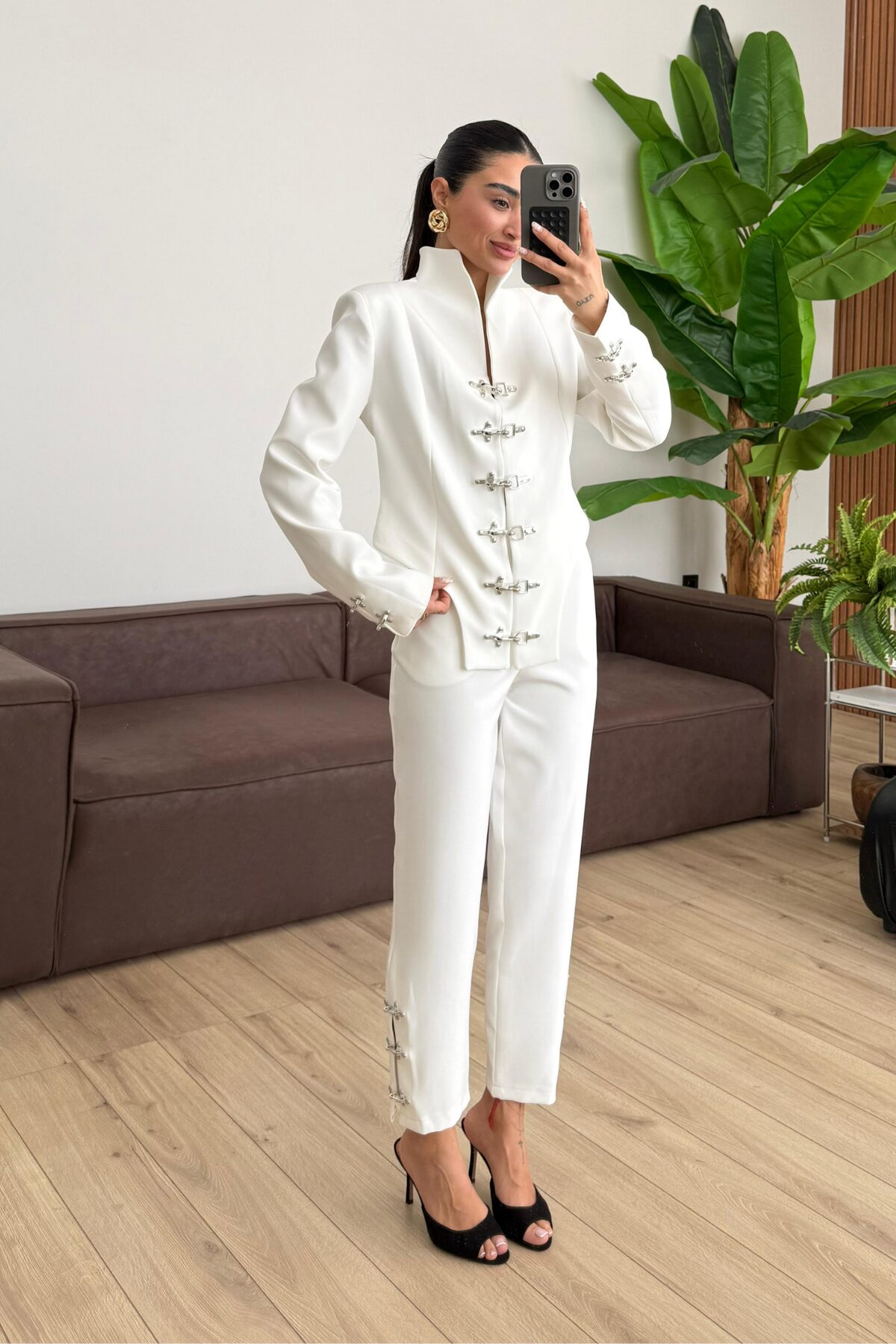Şık Bağlantı Detaylı Ceket Pantolon Takım Beyaz