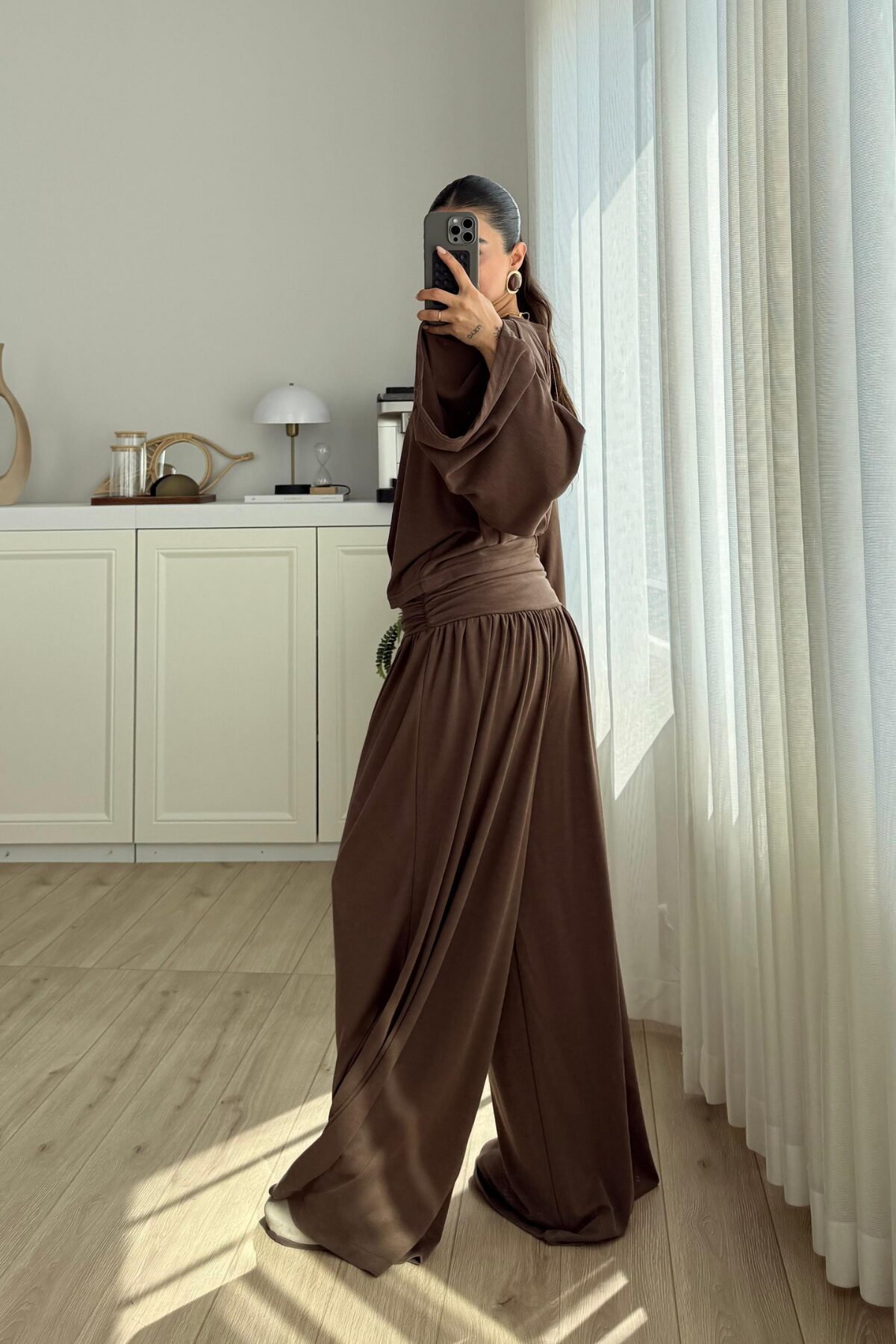 St Yarasa Kollu Beli Drapeli Pantolon Takım Kahverengi