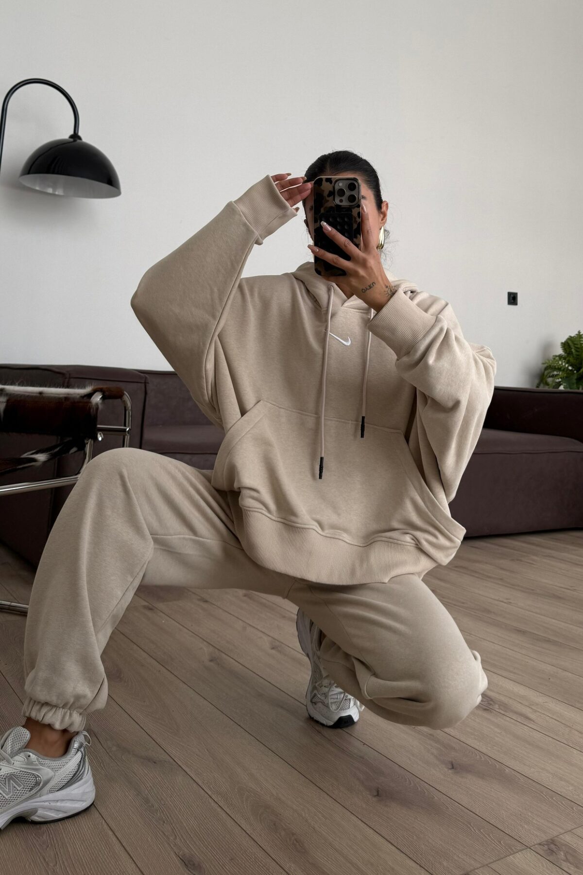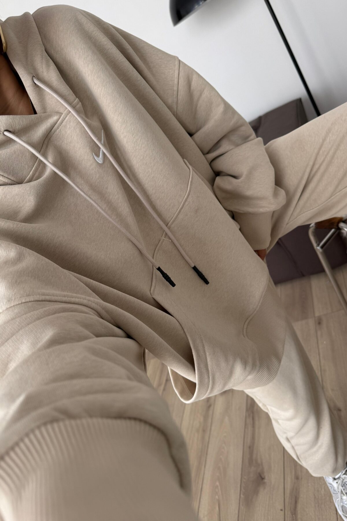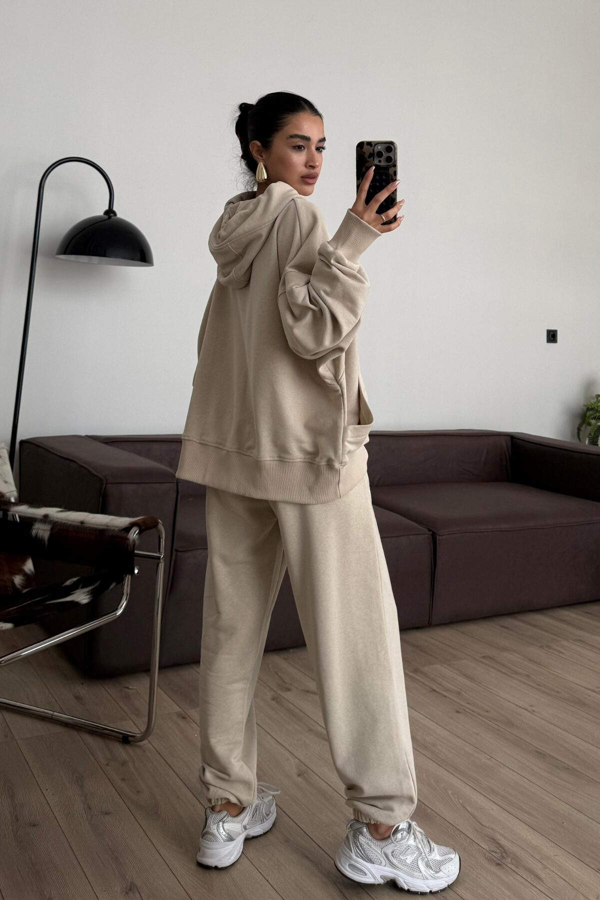 Tasarım Kapşonlu Sweat Eşofman Takım Bej