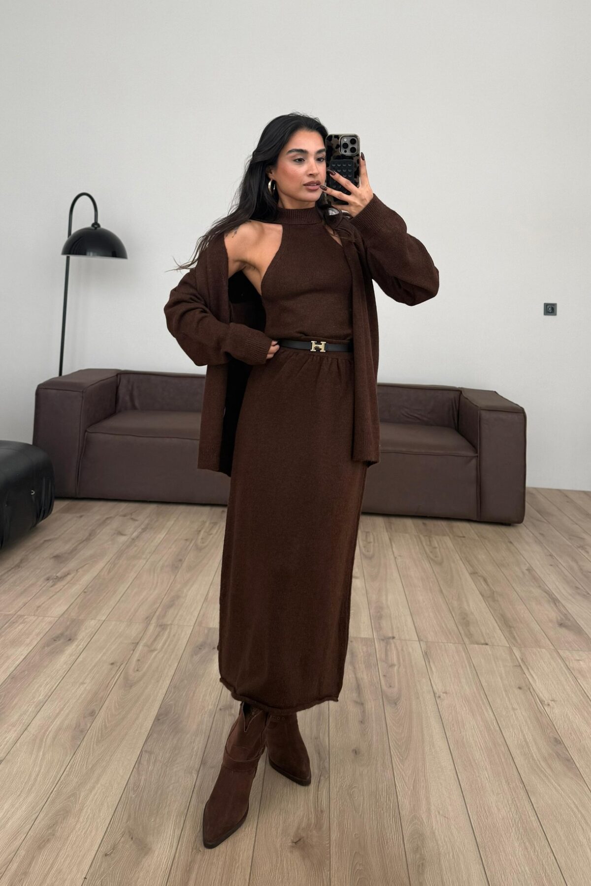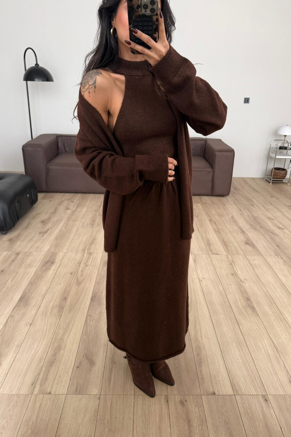 Triko Crop Hırka Etek Takım Kahverengi