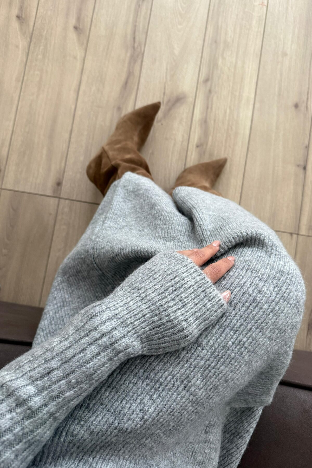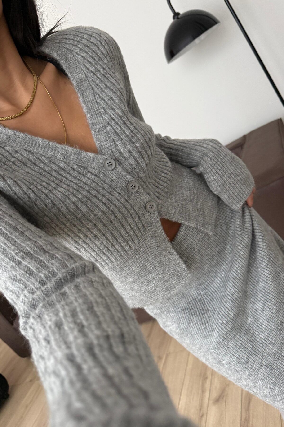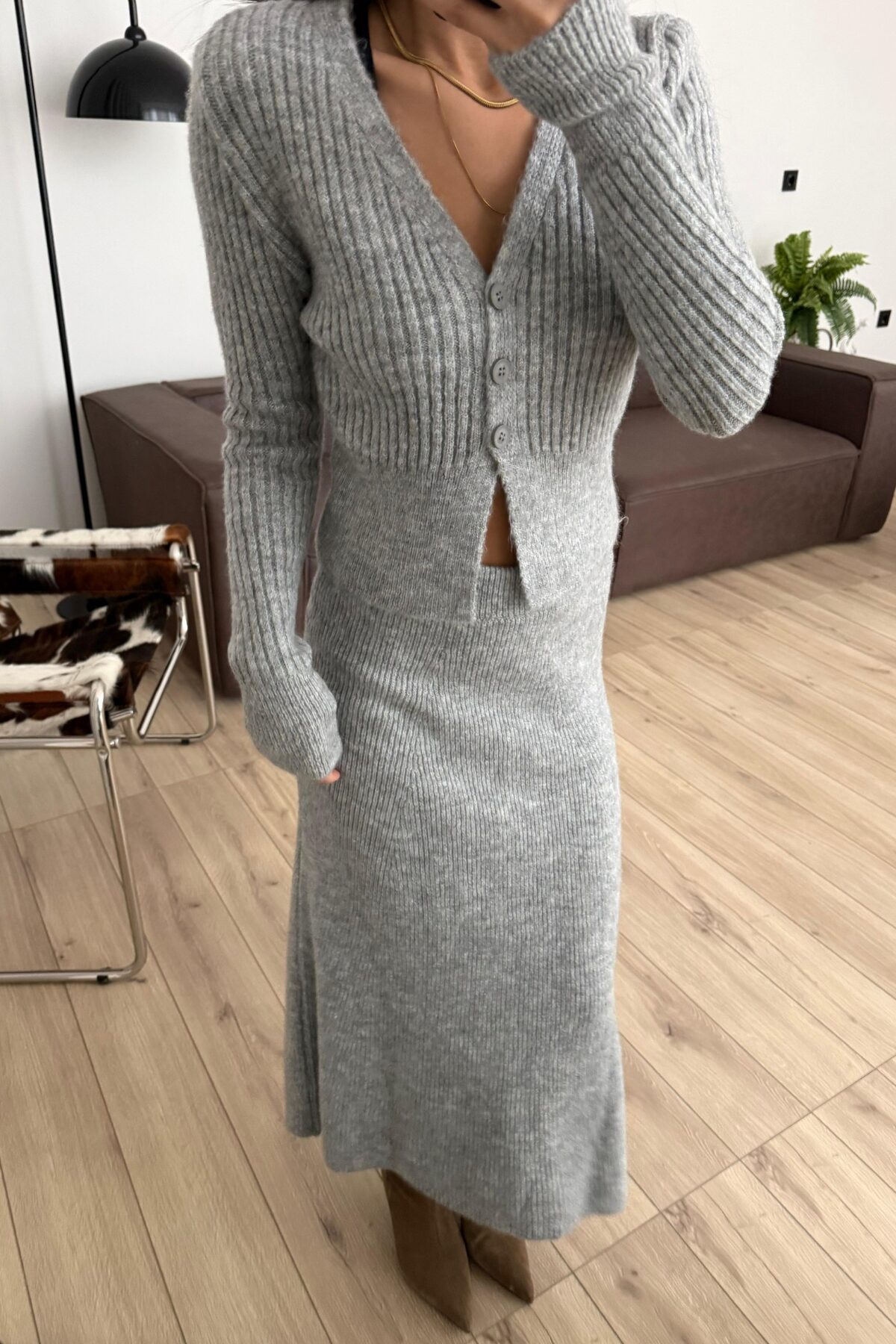 V Yaka Düğmeli Hırka Etek Takım Gri