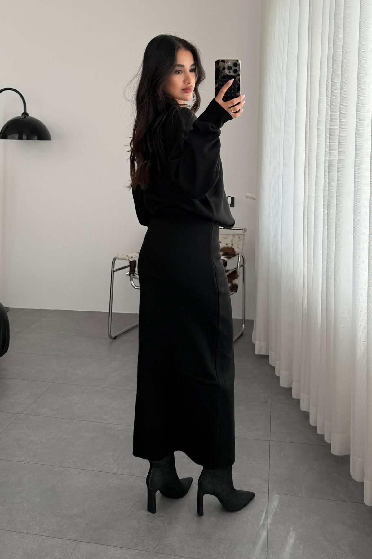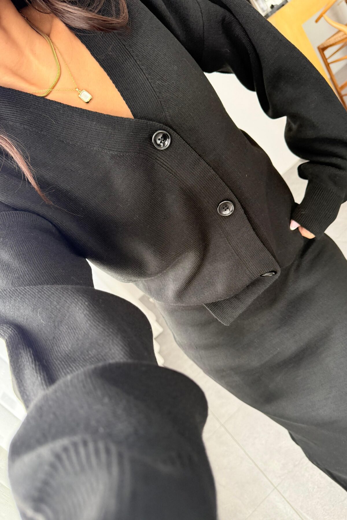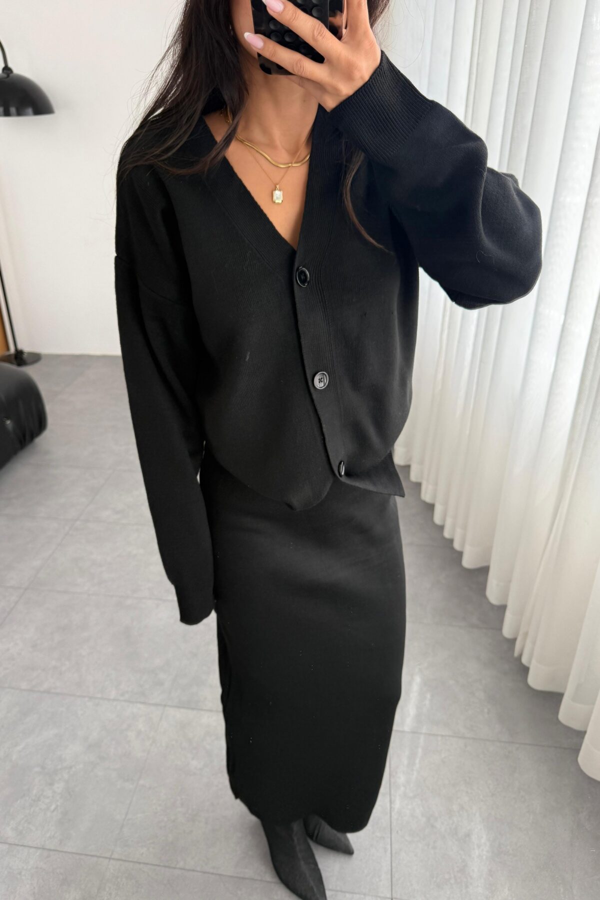 V Yaka Düğmeli Triko Etek Takım Siyah