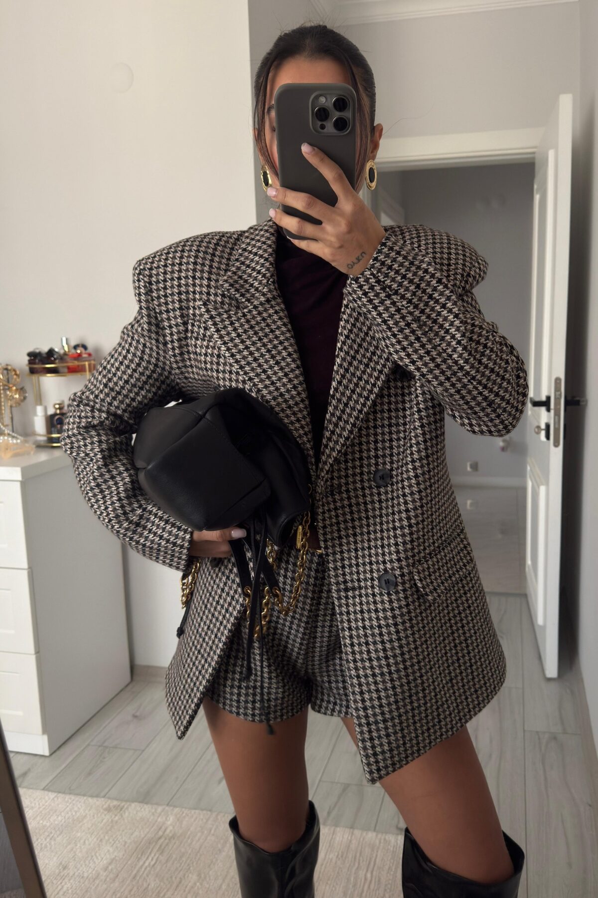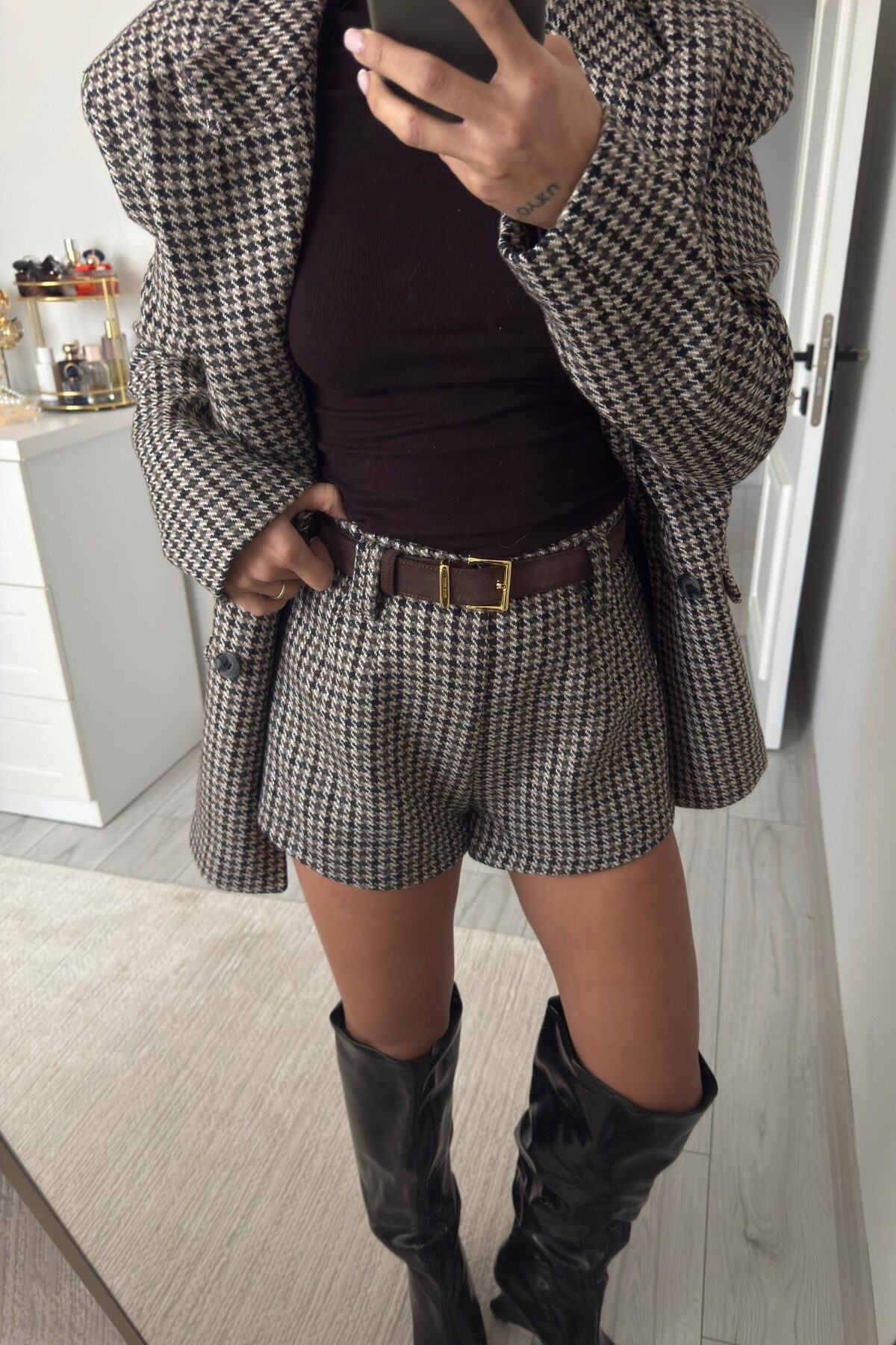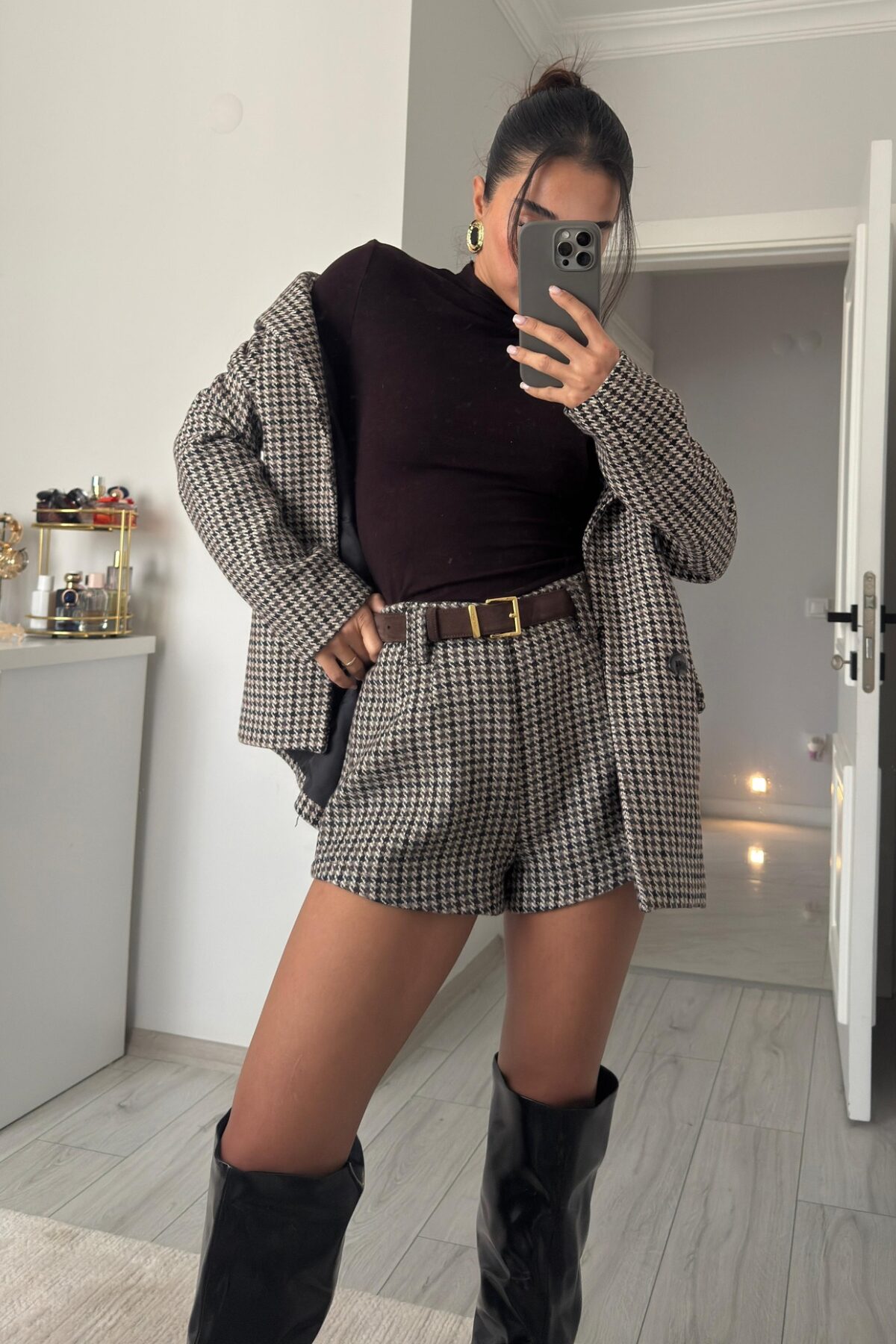 Vatkalı Kazayağı Şortlu Ceket Takım Kahverengi