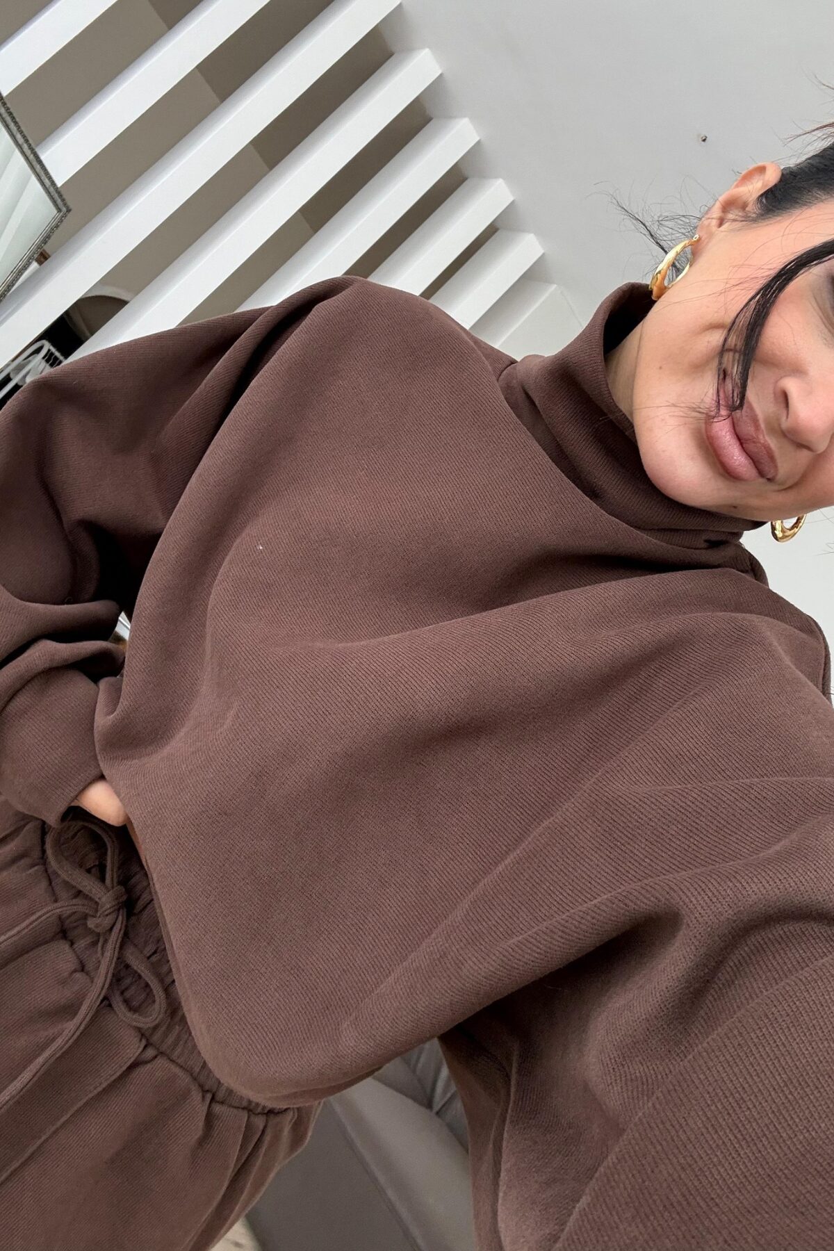 Yarasa Kollu Balıkçı Yaka Triko Takım Kahverengi