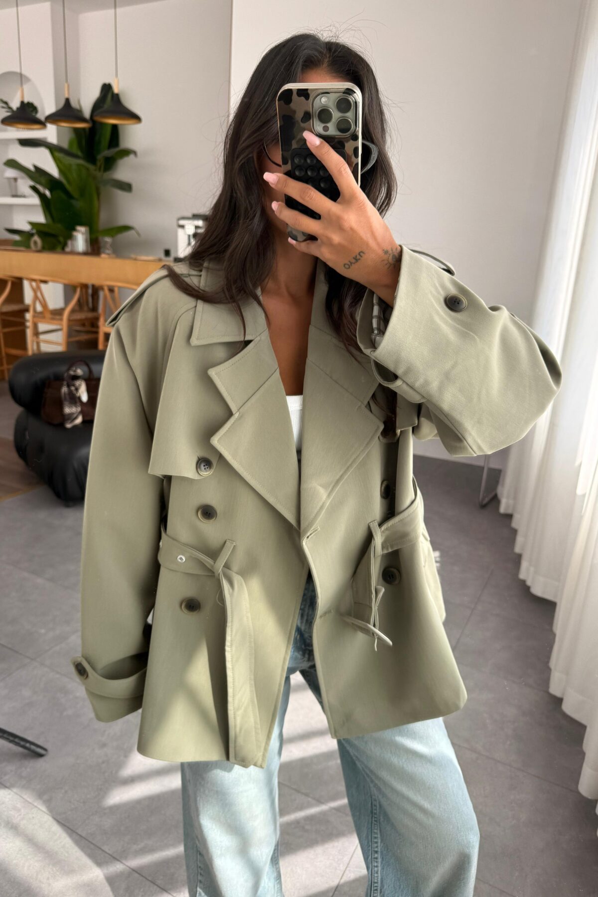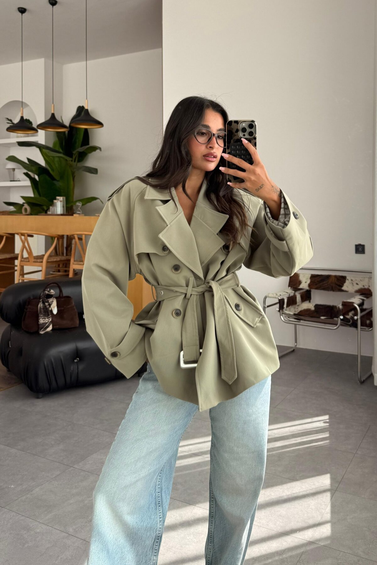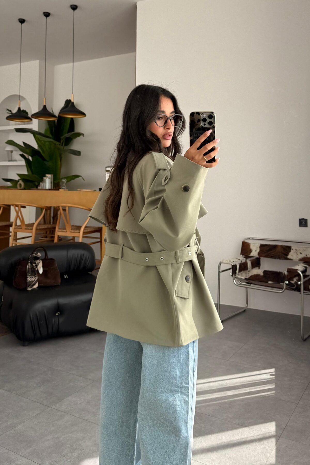 Ara Yakalı Beli Kemerli Kısa Trenç Haki