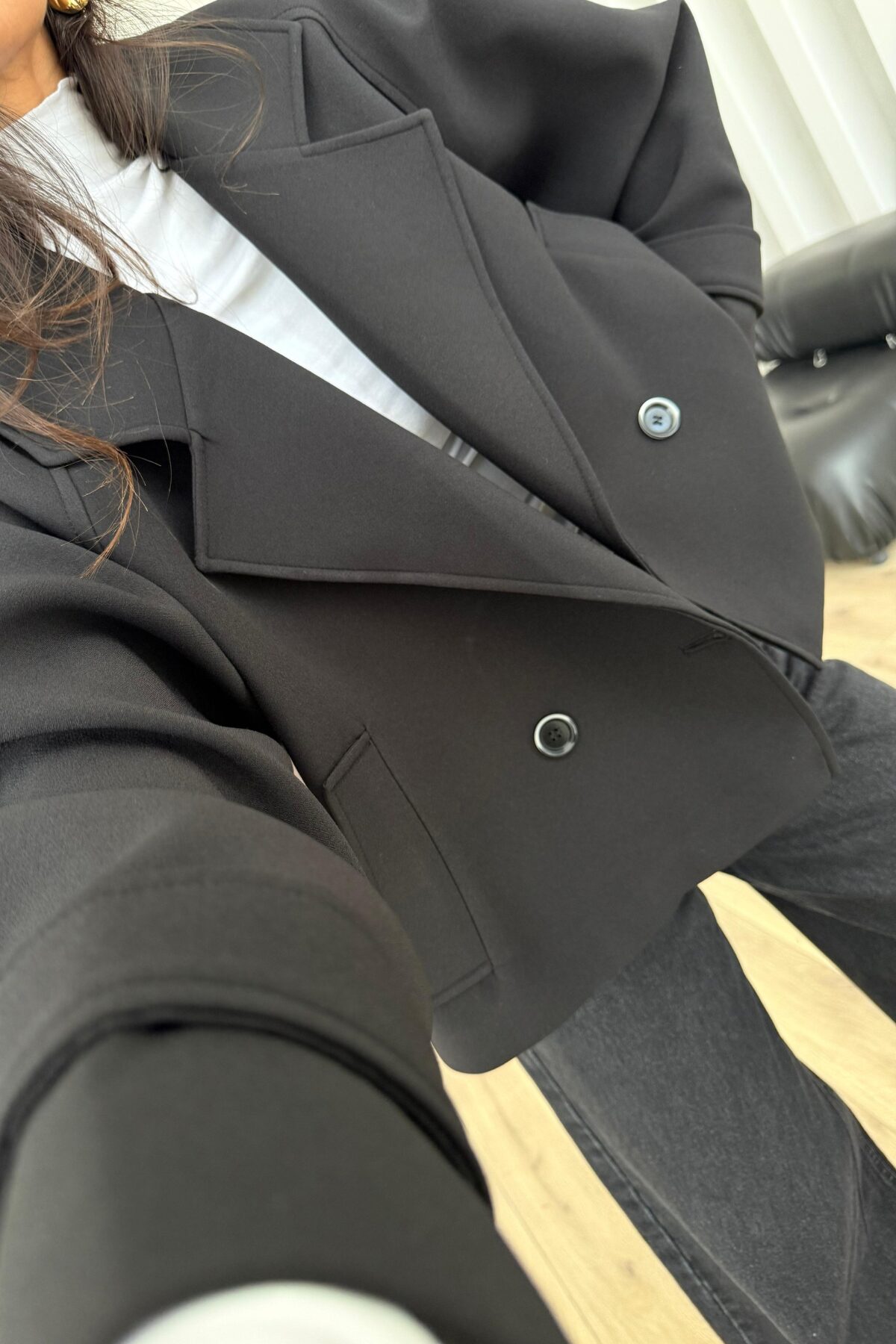 Crep Kumaş Düğmeli Trenç Siyah