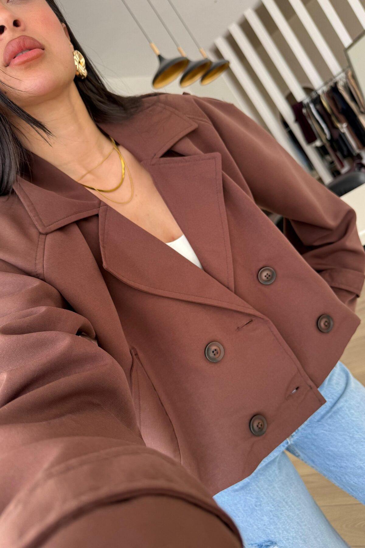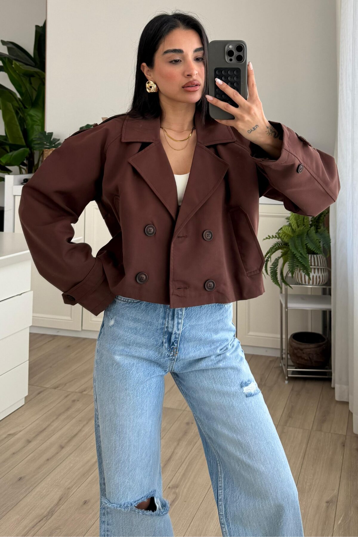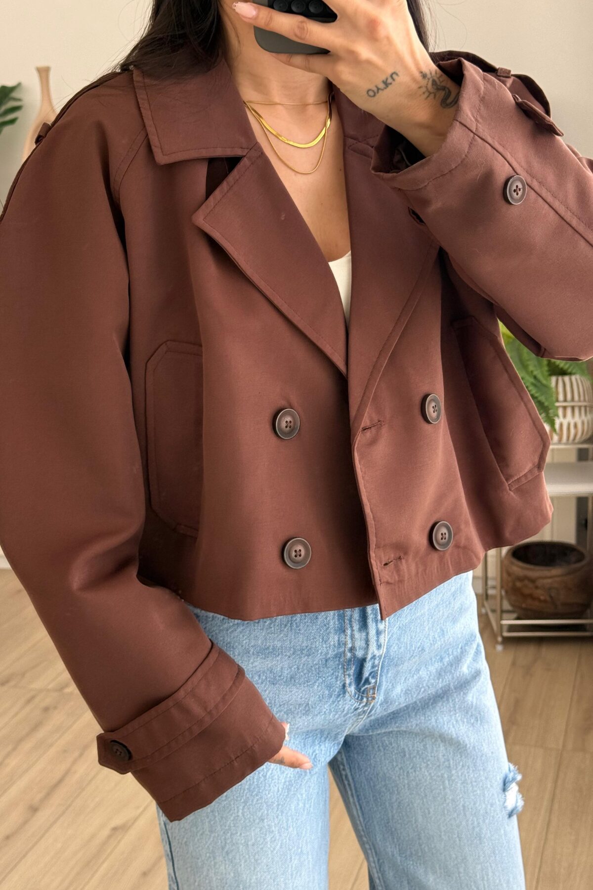 Kısa Düğmeli Trençkot Kahverengi