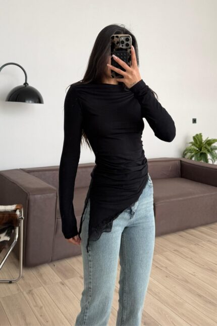 Kayık Yaka Dantel Detaylı Bluz Siyah