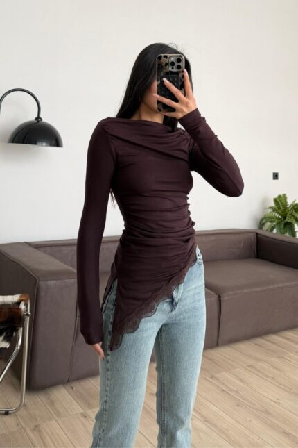 Kayık Yaka Beli Katlamalı Takım Kahverengi