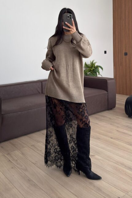 Dantel Detaylı Triko Elbise Vizon