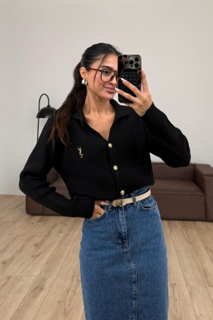 Gold Düğmeli Polo Yaka Hırka Siyah