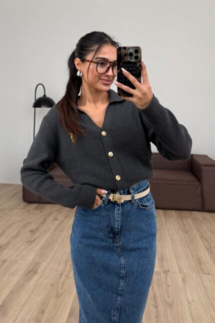 Gold Düğmeli Polo Yaka Hırka Antrasit