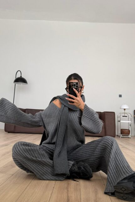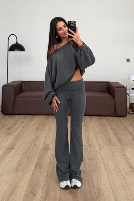 Kayık Yaka Beli Katlamalı Takım Antrasit