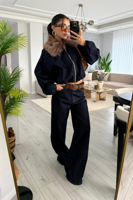 Yakası Kürklü Bomber Ceket Takım Lacivert