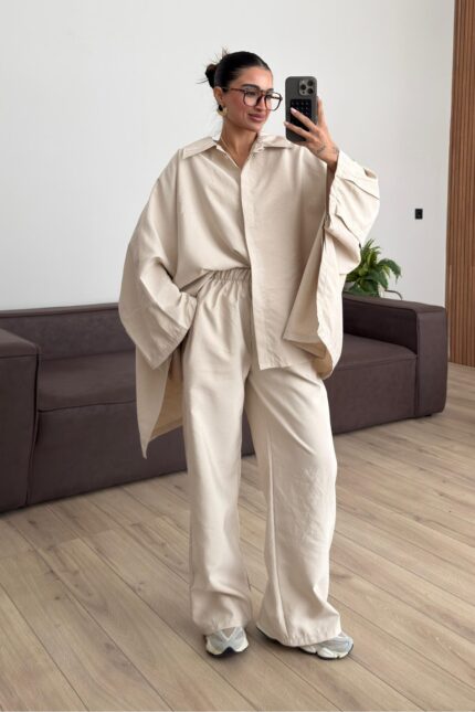 Düğmeli Selen Takım Bej