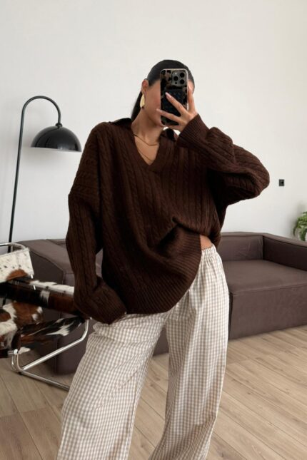 V Yaka Zincir Örgülü Triko Kazak Kahverengi