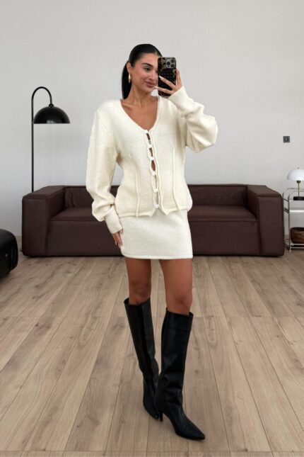 Süet Desenli Gold Düğmeli Etek Takım Kahve