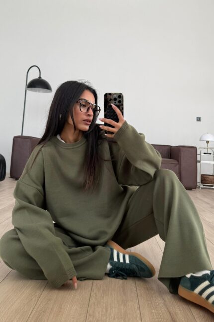 Süet Desenli Gold Düğmeli Etek Takım Yeşil