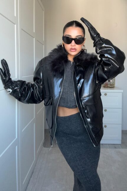 Yakası Kürklü Kanguru Cepli Deri Ceket Siyah