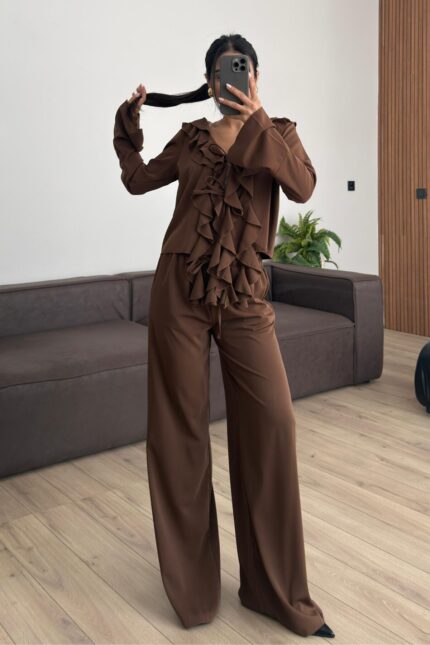 Önü Fırfırlı Kolları Volanlı Pantolon Takım Kahverengi