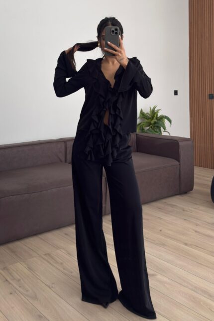 Önü Fırfırlı Kolları Volanlı Pantolon Takım Siyah