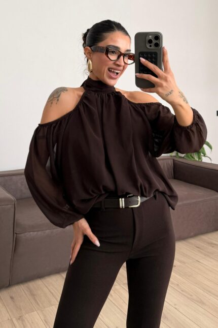 Şifon Boyundan Bağlamalı Bluz Kahverengi