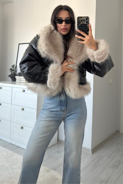 Beli Lastikli Yakası Kürklü Deri Ceket Siyah