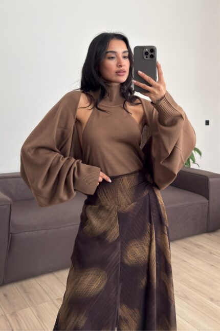 Bolerolu Boğazlı Sırtı Açık Bluz Kahverengi