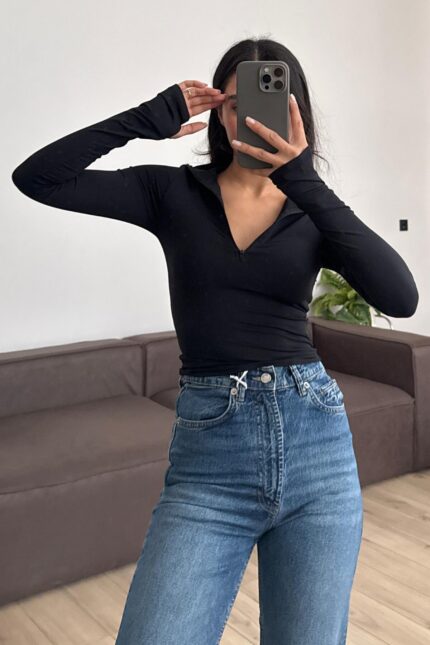 Yarım Fermuarlı Soft Touch Bluz Siyah